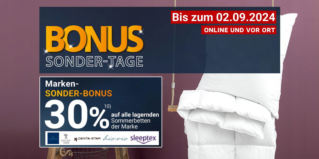 ¹⁰) Wohn-Zentrum: Gilt auf UVP bzw. Zurbrüggen-Listenpreis für alle gekennzeichneten Artikel „30 % Rabatt”. Der Rabatt ist bereits im Preis berücksichtigt. Nicht kombinierbar mit anderen Rabatt- und Tauschaktionen. Keine Verrechnung mit bereits getätigten Käufen. Zeitraum: Gültig bis 02.09.2024. Onlineshop: Gilt für alle Artikel auf dieser Seite https://www.zurbrueggen.de/30-auf-sommerbetten/. Nicht kombinierbar mit anderen Rabatt- und Tauschaktionen. Keine Verrechnung mit bereits getätigten Käufen. Ausgenommen sind Artikel mit der Kennzeichnung Werbeaktion. Zeitraum: Gültig bis 02.09.2024.