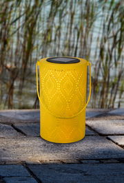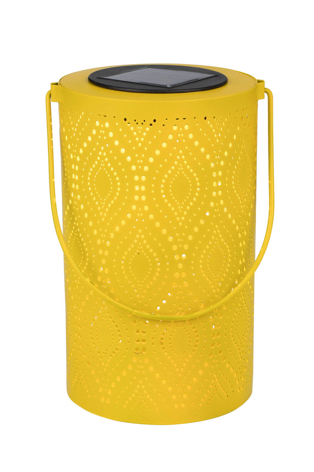 Die gelbe LED-Solarleuchte sorgt für ein fröhliches Balkon- und Gartenambiente nach Sonnenuntergang. Die zylinderförmige Metallleuchte verfügt über ein orientalisches Musterdesign, das sich besonders stilvoll zum bohoorientierten Outdoorambiente macht. Durch den praktischen kleinen Henkel kann die hochwertige Leuchte (B/H/T ca. 12 x 20 x 12 cm, Gewicht 1,25 kg) auch in einen Baum oder in Mehrfachausführung an eine Pergola appliziert werden. Wird das solarbetriebene LED-Leuchtmittel (durchschnittliche Lebensdauer 10.000 Stunden, Schutzklasse I, inklusive Batterie) eingeschaltet, erhalten Sie eine warmweiße Lichtstreuung (3.000 K, CRI > 80). Gönnen Sie sich die LED-Solarleuchte auch noch in anderen Farben!