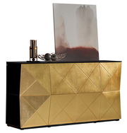 Dieses Sideboard ist ein absoluter Gewinn für alle Freunde schöner Möblierung. Das Modell RUBY PLUS ist mit vier Drehtüren ausgestattet, hinter welchen sich Ihnen Stauraum zum Unterbringen verschiedenster Gegenstände bietet, und sorgt mit seiner Schublade für Ordnung in Ihrem Zuhause. Nutzen Sie den Platz von drei Böden. Der Schubladenschrank begeistert in Ambiente-Markenqualität mit gut durchdachtem Design und einem einzigartigen Wohngefühl. Der moderne Stil harmoniert ausgezeichnet mit nahezu jedem Einrichtungskonzept. Die Kommode aus Holz-Nachbildung hat die Farbe Gold. Sie weist eine Gesamtbreite von 180 cm, eine Höhe von 94 cm sowie ein Tiefenmass von 53,5 cm auf. Das Modell RUBY PLUS kommt mit einem Gewicht von 135 kg. Ausserdem runden die Fronten aus einem goldenen Material das stimmige Gesamtbild des Möbels ab. Sie werden diesen Schubladenschrank lieben.