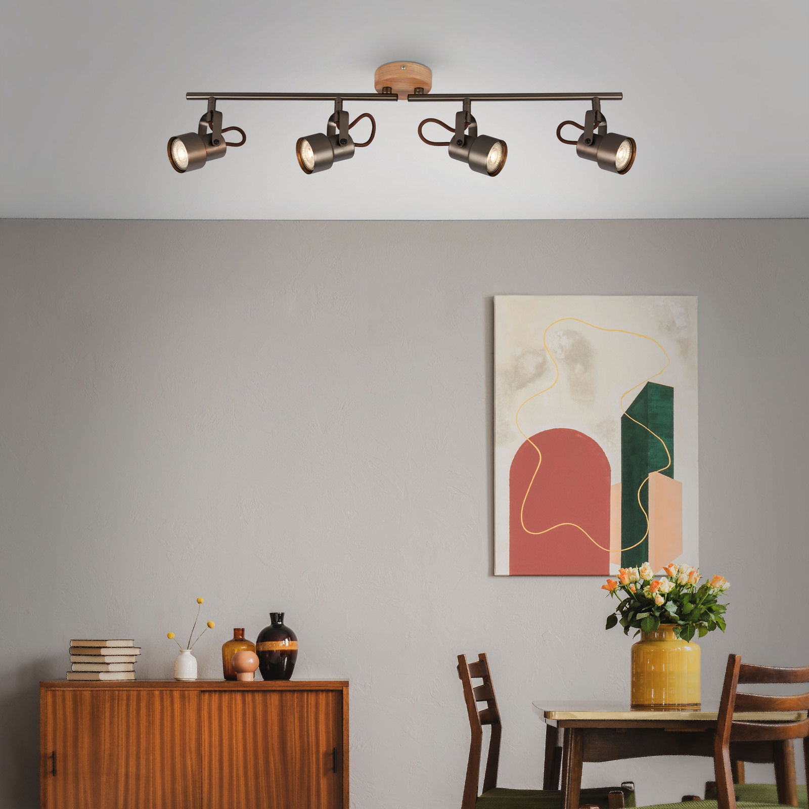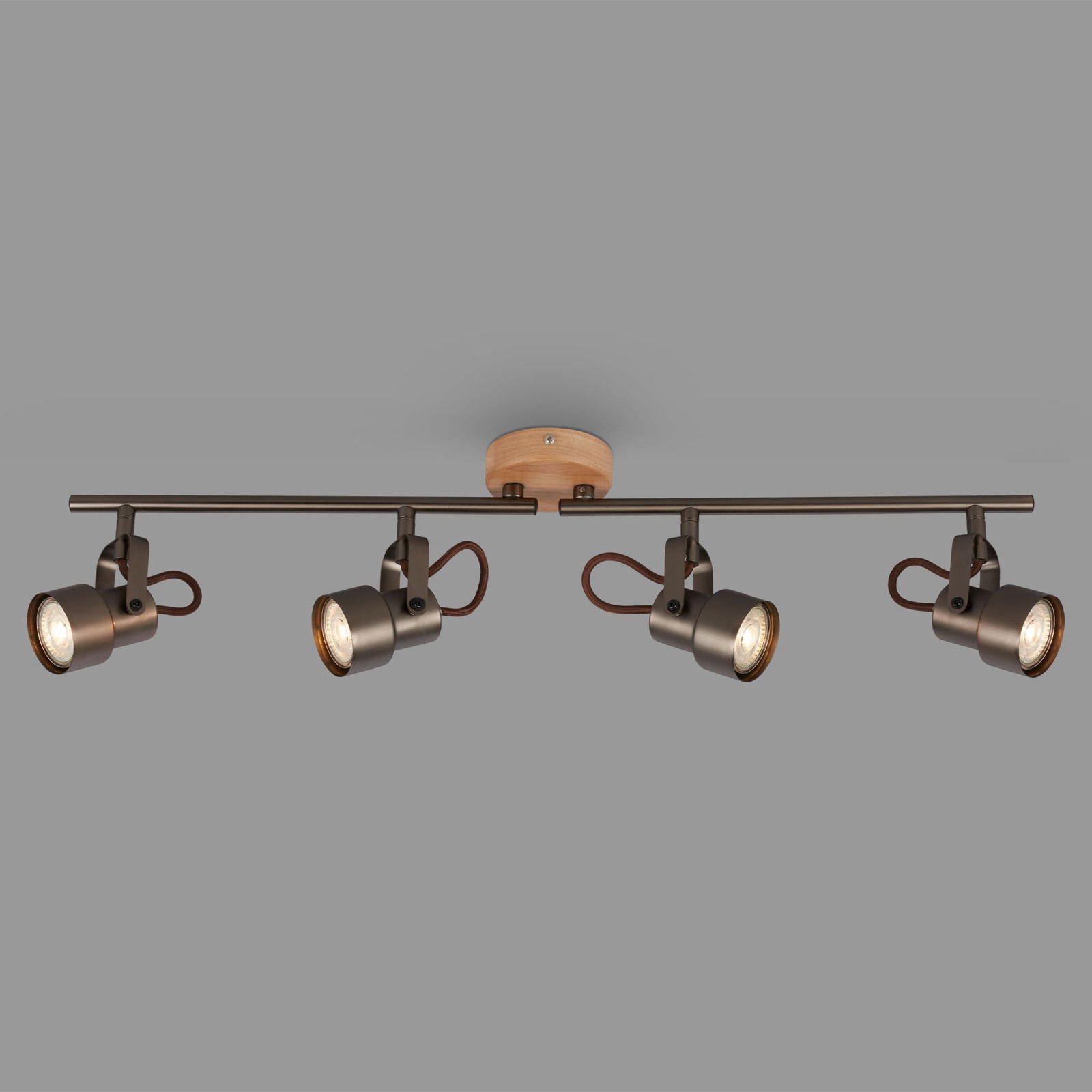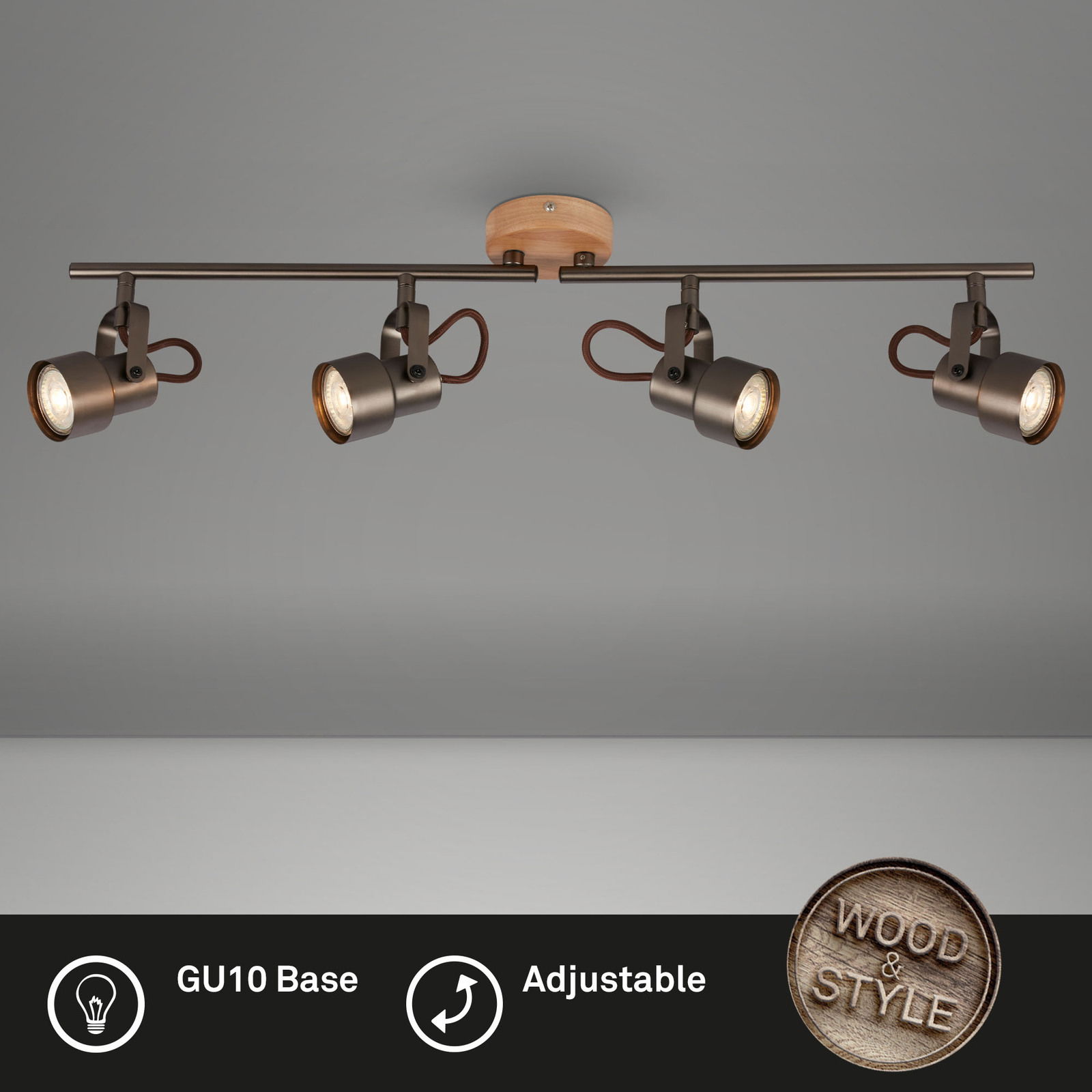 Die Briloner Spotleuchte TAHUN vereint modernes Design mit funktionaler Beleuchtung. In einer eleganten bronzenen Hauptfarbe gehalten, fügt sie sich nahtlos in jedes Wohnambiente ein. Mit einer Lichtfarbe von Warmweiß schafft die Spotleuchte eine angenehme Atmosphäre in Ihrem Zuhause. Die Leuchte ist mit vier leistungsstarken GU 10 LED-Leuchtmitteln ausgestattet, die jeweils 5 Watt bieten und damit für eine helle Ausleuchtung sorgen. Dank der Farbtemperatur von 3000K erzeugt sie ein warmes und einladendes Licht. Die Spotleuchte ist aus hochwertigem Metall gefertigt und bietet mit einem Lichtstrom von 460 Lumen eine optimale Lichtausbeute.