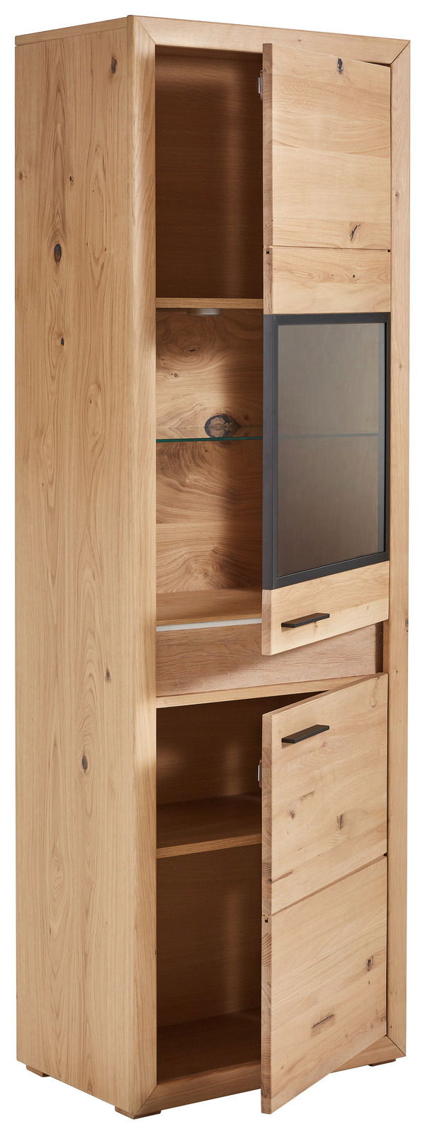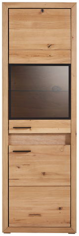 Die Cantus Vitrine CLEVELAND ist die perfekte Wahl für alle, die modernes Design mit der natürlichen Schönheit von Holz kombinieren möchten. Diese stilvolle Vitrine besticht durch ihre massive Front aus Kerneiche Wildwuchs, die in harmonischem Kontrast zum teilmassiven Korpus in Eiche steht. Die Sichtteile aus Asteiche verleihen dem Möbelstück eine besondere Note. Mit zwei Türen bietet die Vitrine genügend Platz für Ihre liebsten Sammlerstücke oder Bücher. Die integrierte Frontbeleuchtung und der 1er LED Power Spot in Weiß setzen Ihre Objekte effektvoll in Szene und schaffen eine einladende Atmosphäre in jedem Raum.