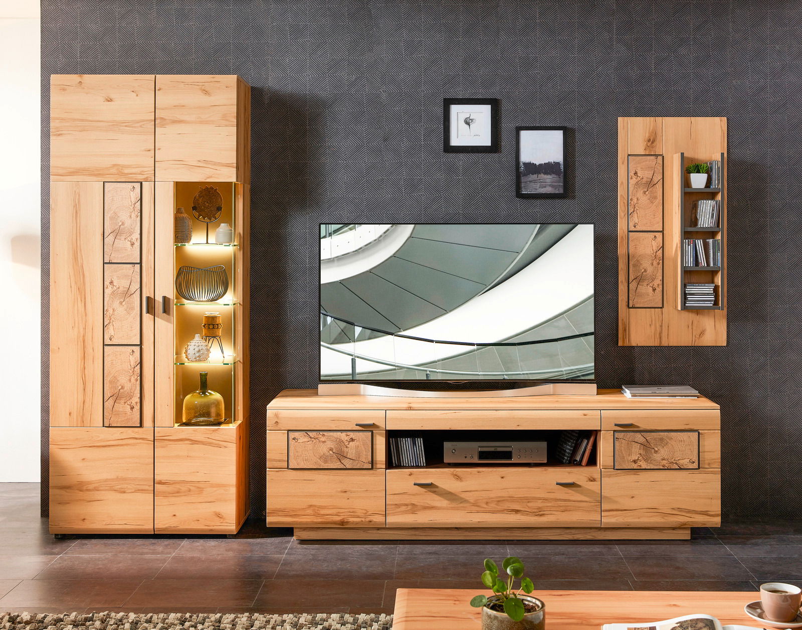 Wandkombination mit PlatzangebotAuf B/H/T ca. 299 x 201 x 47 cm, verteilt auf Vitrinenschrank, TV-Lowboard und Wandregalpaneel, finden Dekoartikel und Medienstation Platz. Im Vitrinenfach mit Klarglas (optional beleuchtbar) setzen Sie Schönes in Szene. Anthrazitfarbene Metallgriffe und Schubladen mit Softclose-Selbsteinzug machen die Handhabung komfortabel. Bereichern Sie Ihr Wohnzimmer mit der Cantus Wandkombination "BERN"!