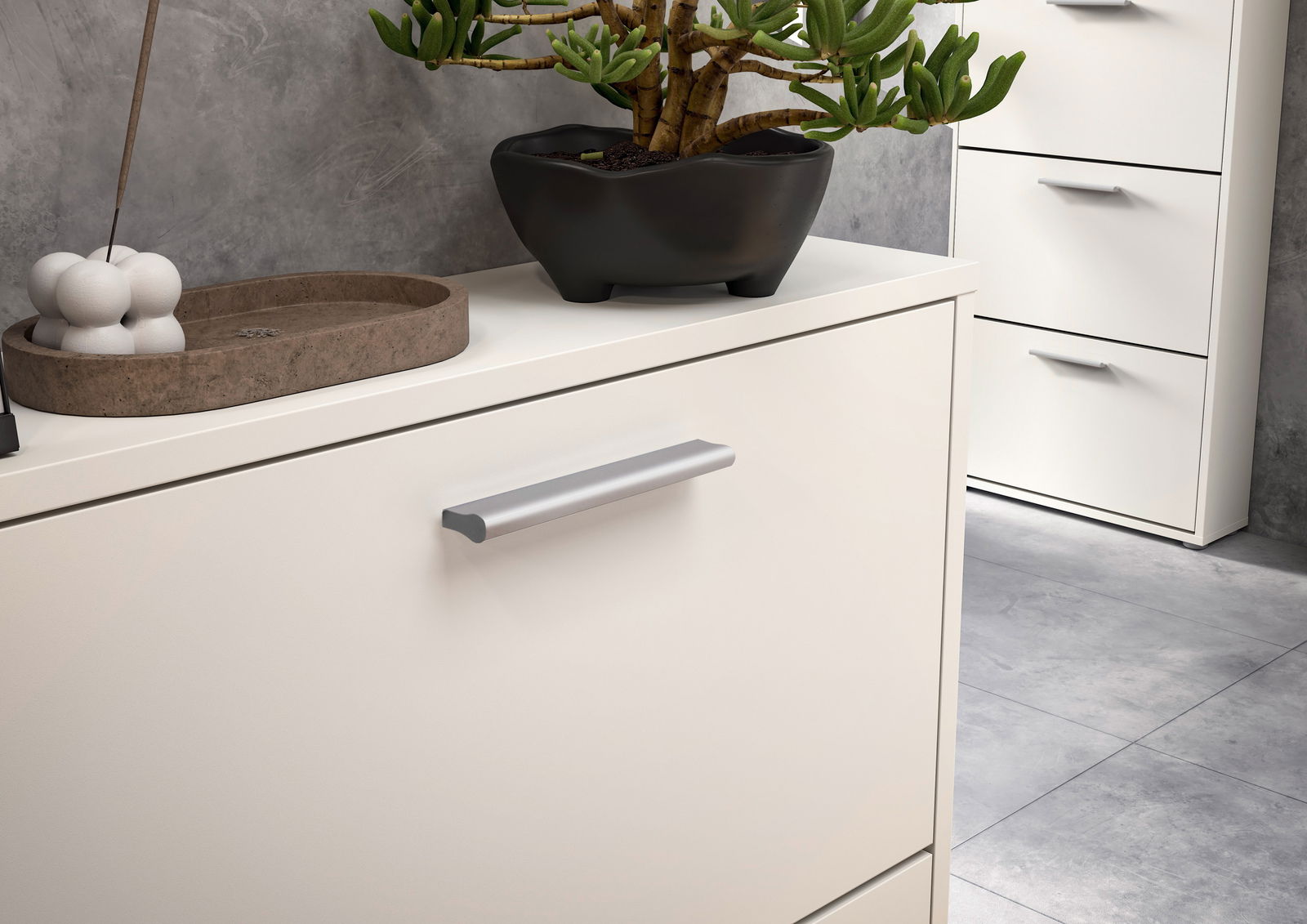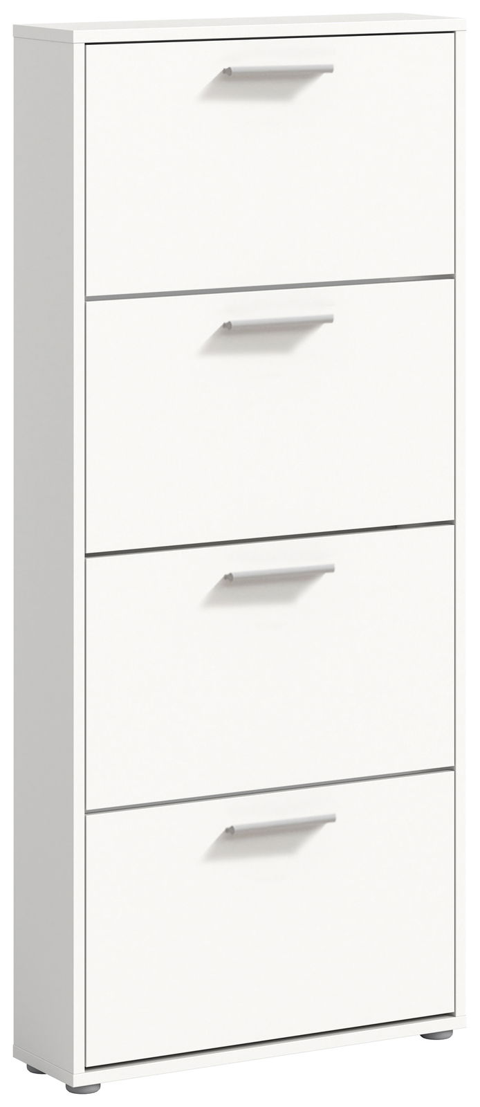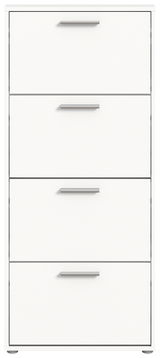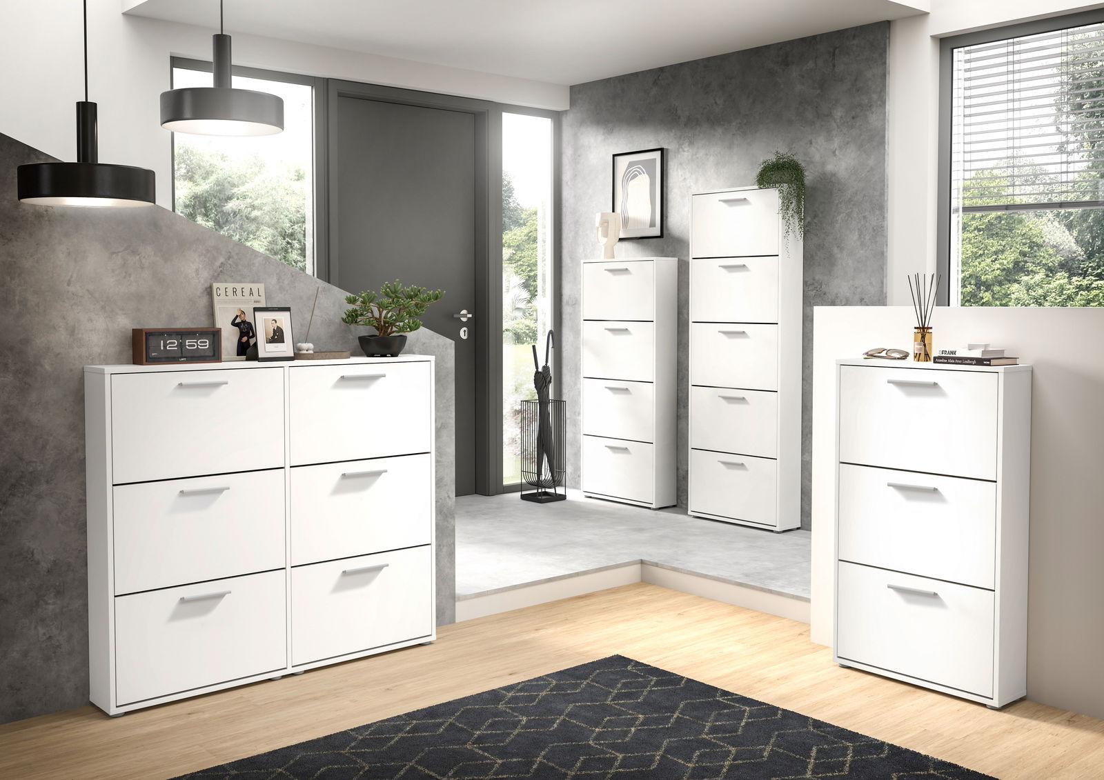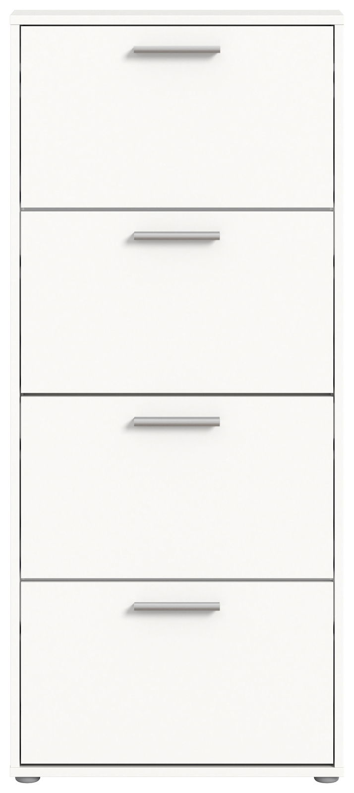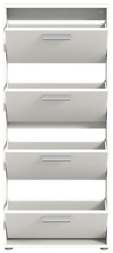 Der Carryhome Schuhkipper 4er SAM beeindruckt durch sein modernes Design und seine Funktionalität. Mit einer Höhe von 136,00 cm, einer Tiefe von 17,00 cm und einer Breite von 59,00 cm bietet dieser Schuhkipper ausreichend Platz für Ihre Schuhsammlung. Die elegante Kombination aus weissem Melamin und grauen Kunststofffüssen verleiht Ihrem Eingangsbereich einen zeitgemässen Look. Der Korpus und die Front sind in einem strahlenden Weiss gehalten, was für eine helle und freundliche Atmosphäre sorgt. Die Stangengriffe runden das stilvolle Erscheinungsbild ab und sorgen für eine einfache Handhabung.