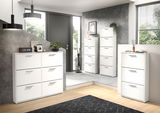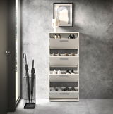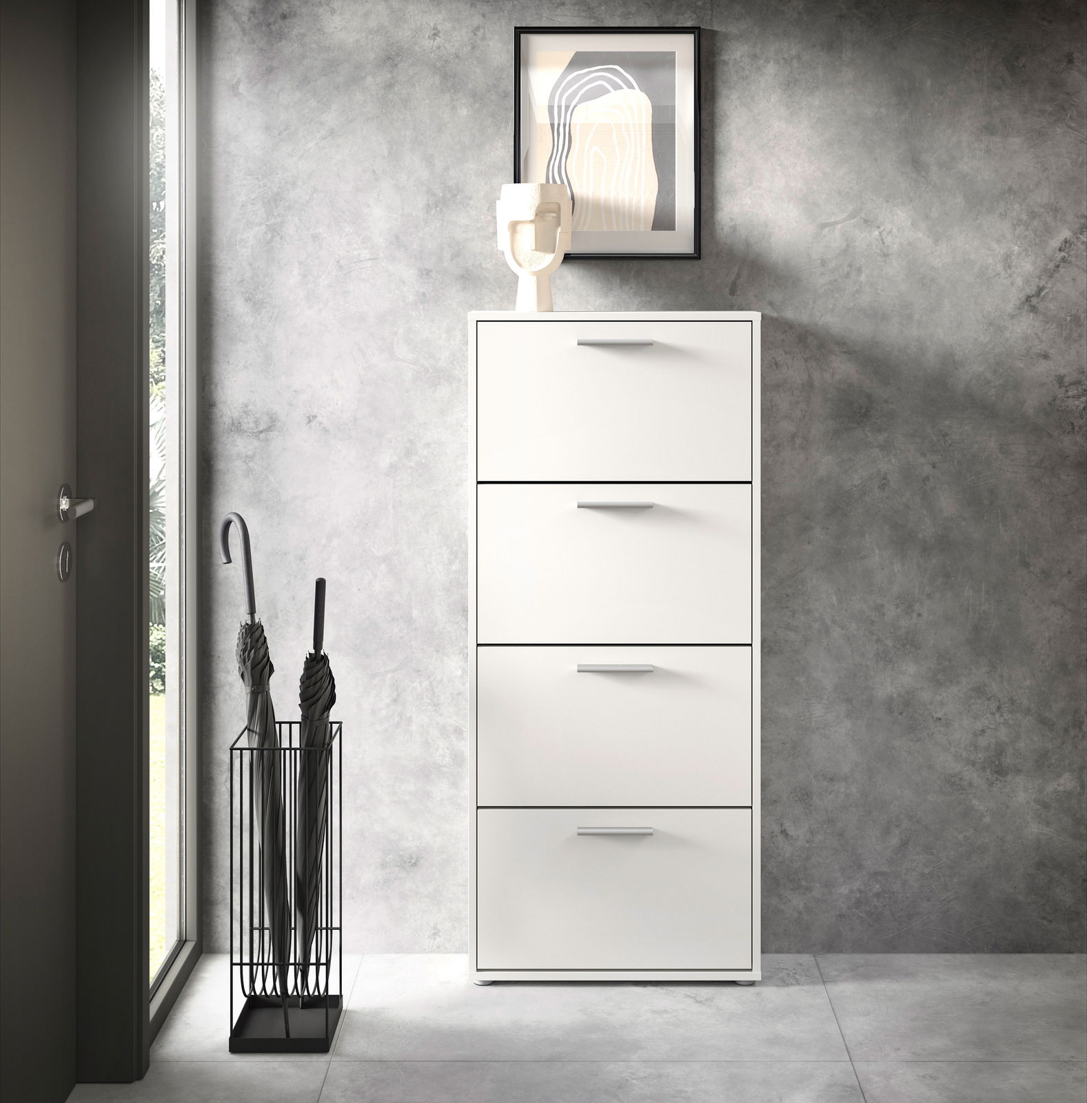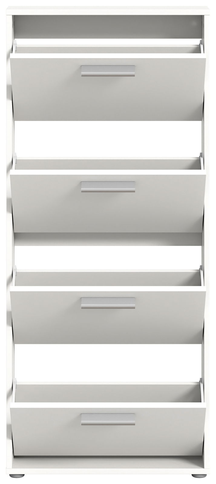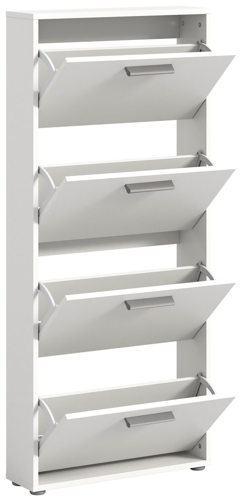 Der Carryhome Schuhkipper 4er SAM beeindruckt durch sein modernes Design und seine Funktionalität. Mit einer Höhe von 136,00 cm, einer Tiefe von 17,00 cm und einer Breite von 59,00 cm bietet dieser Schuhkipper ausreichend Platz für Ihre Schuhsammlung. Die elegante Kombination aus weissem Melamin und grauen Kunststofffüssen verleiht Ihrem Eingangsbereich einen zeitgemässen Look. Der Korpus und die Front sind in einem strahlenden Weiss gehalten, was für eine helle und freundliche Atmosphäre sorgt. Die Stangengriffe runden das stilvolle Erscheinungsbild ab und sorgen für eine einfache Handhabung.