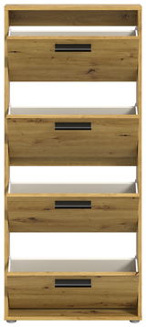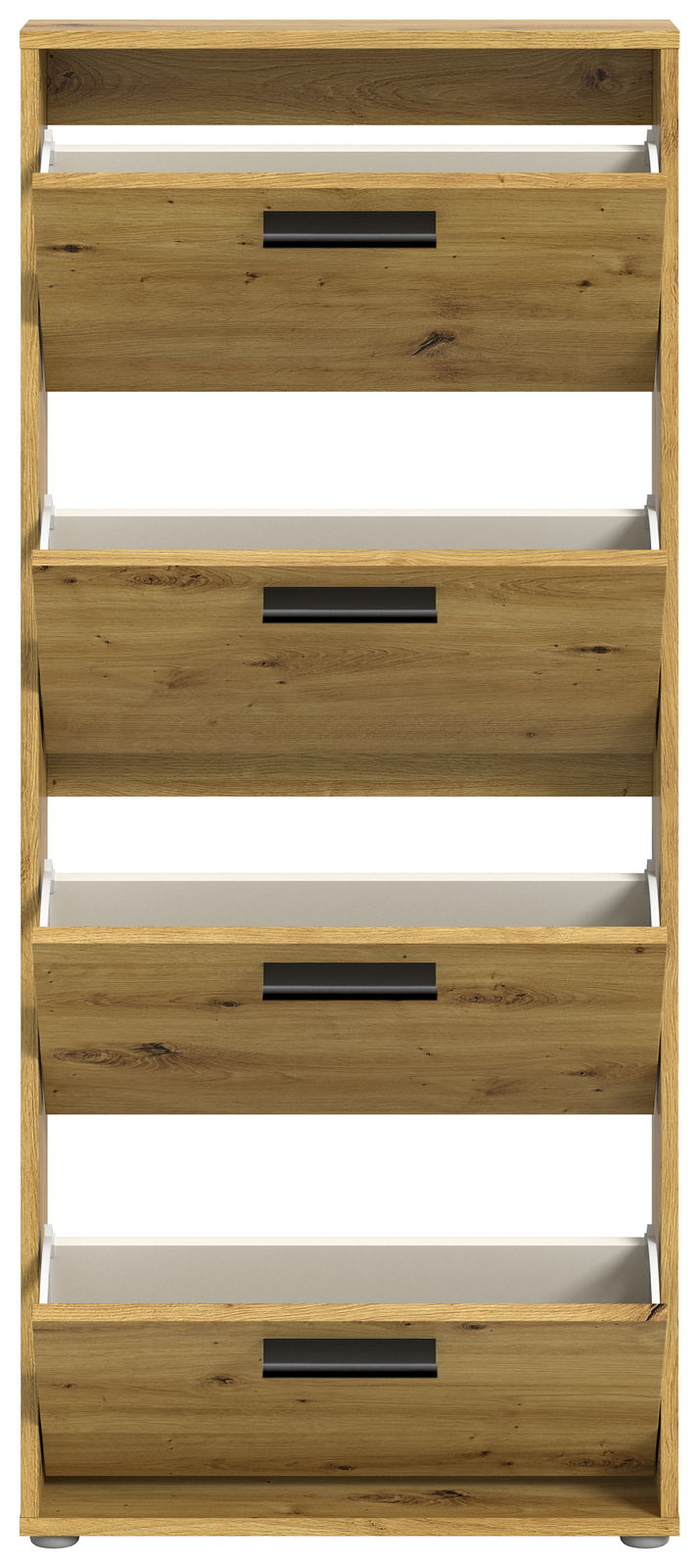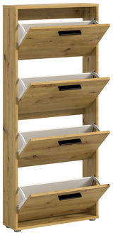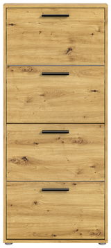 Der Carryhome Schuhkipper 4er SAM bringt modernen Stil und trendiges Design in Ihr Zuhause. Die Front und der Korpus sind in einer eleganten Eiche Artisan Optik gehalten, die dem Schuhkipper eine warme und einladende Ausstrahlung verleiht. Die mattschwarzen Stangengriffe ergänzen das stilvolle Design perfekt. Mit einer Höhe von 136 cm, einer Tiefe von 17 cm und einer Breite von 59 cm bietet dieser Schuhkipper ausreichend Platz für Ihre Schuhe, ohne dabei viel Raum in Anspruch zu nehmen. Die Füsse aus grauem Kunststoff verleihen dem Möbelstück Stabilität und einen modernen Touch.