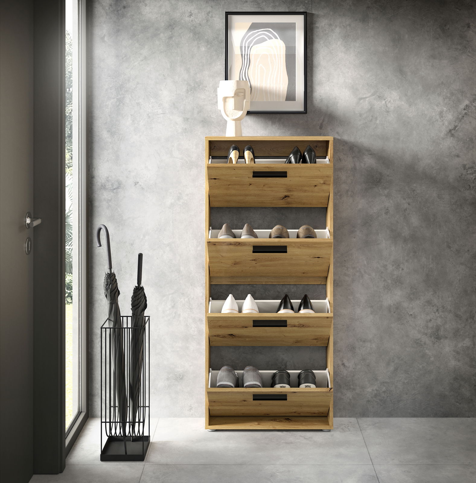 Carryhome Schuhkipper 4er – Platzsparend und Stilvoll Der praktische Schuhkipper überzeugt nicht nur durch sein modernes Design, sondern auch durch seine Funktionalität. Gefertigt aus hochwertiger Holznachbildung und ausgestattet mit robusten Kunststofffüssen, ist er langlebig und pflegeleicht. Das Melamin-Finish in Artisan Eiche sorgt für eine ansprechende Optik und schützt das Material vor Abnutzung. Der Schuhkipper bietet Platz für eine Vielzahl von Schuhen, sodass Sie Ihre Sammlung ordentlich und übersichtlich verstauen können. Erleben Sie die perfekte Kombination aus Design und Funktionalität und bestellen Sie jetzt den Carryhome Schuhkipper 4er SAM!