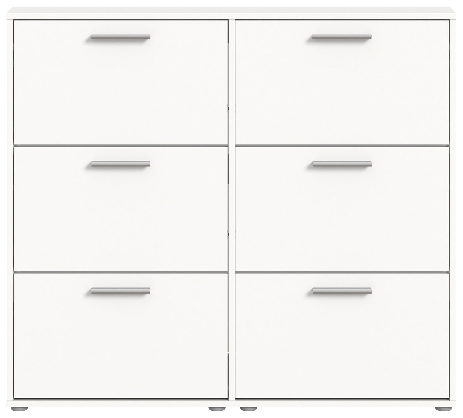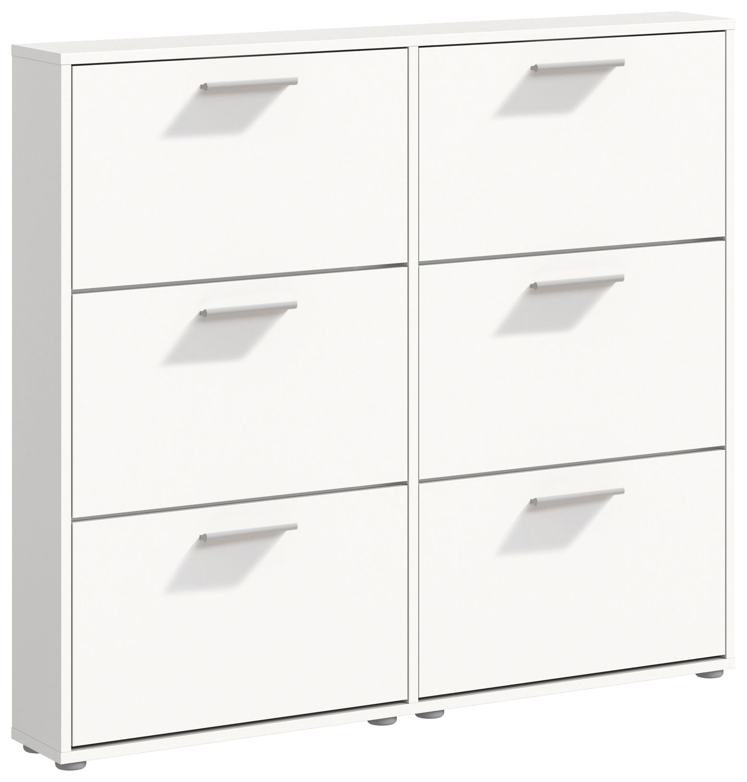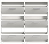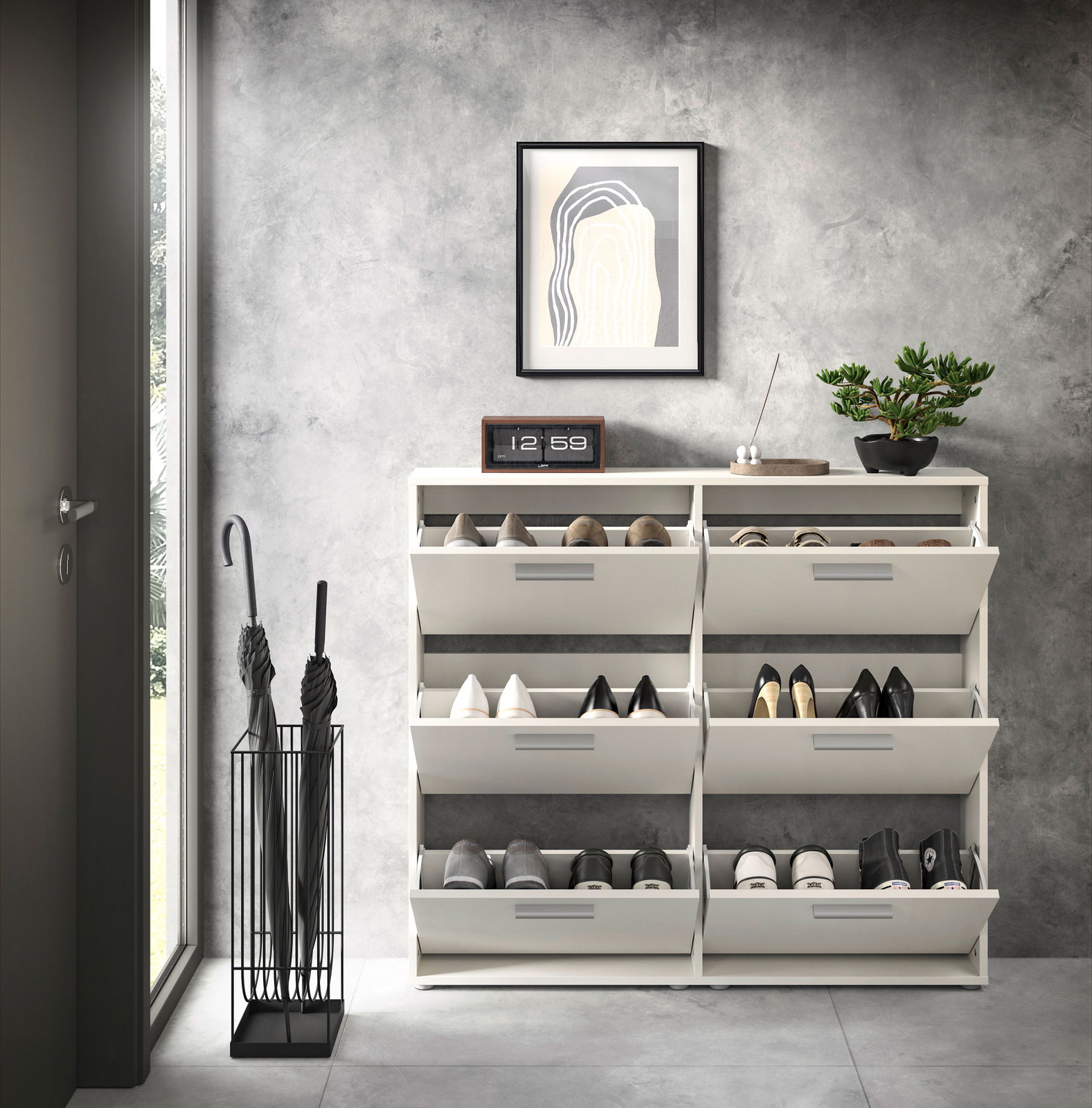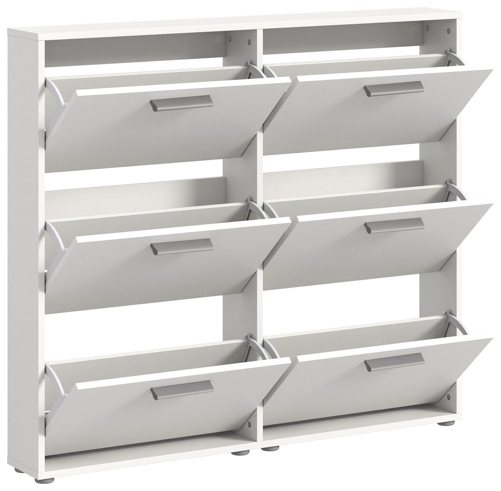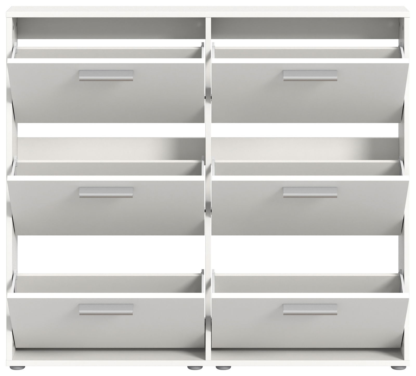 Der Carryhome Schuhkipper 6er SAM überzeugt durch sein modernes und trendiges Design, das sich perfekt in jedes zeitgemässe Zuhause einfügt. Mit einer Höhe von 103 cm, einer Tiefe von 17 cm und einer Breite von 116 cm bietet dieser Schuhkipper ausreichend Platz, um Ihre Schuhe ordentlich und übersichtlich zu verstauen. Die weisse Melamin-Front und der Korpus in Weiss verleihen dem Schuhkipper eine elegante Optik, während die grauen Kunststofffüsse für Stabilität sorgen. Der praktische Stangengriff ergänzt das moderne Design und sorgt für eine einfache Handhabung.