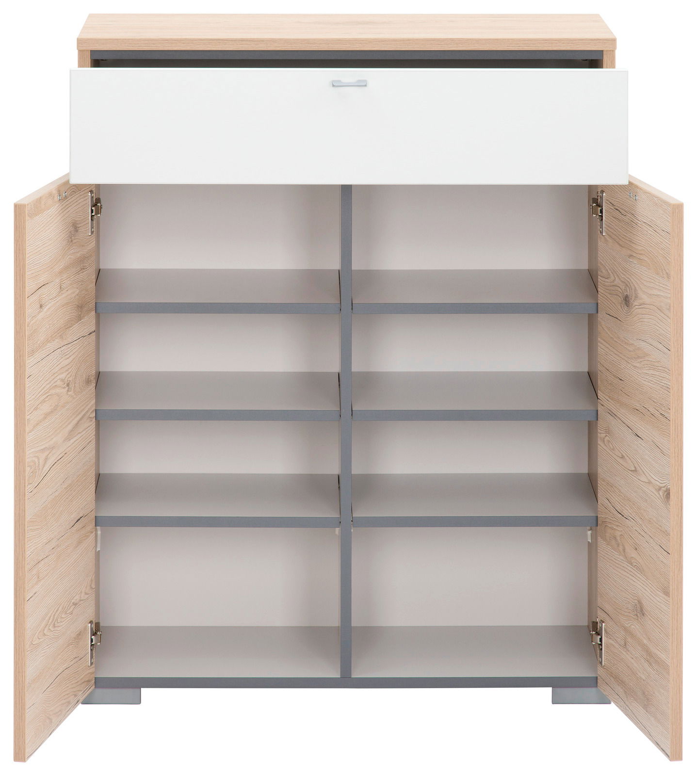 Benötigen Sie einen geräumigen Stauraumpartner im modernen landhausorientierten Korridor, dann ist der Cassando Schuhschrank "BASIC" die richtige Wahl. Mit seiner attraktiven Front in San-Remo-Eiche-Dekor und der hochglanzweißen Schublade verströmt das Modell einen aufgeräumten Charakter.