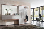 Die Cassando Vorschlagskombi Garderobe "PASSARE" überzeugt mit puristischer Eleganz. Korpus-Seiten und Fronten im lackierten Graubeige erhalten durch furnierte braune Kernnussbaum-Absetzungen ein behagliches Erscheinungsbild. Chrom-Stangengriffe und der Flachspiegel komplettieren die cleane Erscheinung.