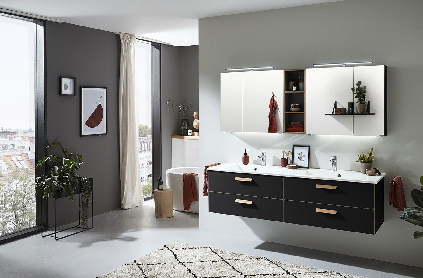 Die geradlinige Dieter Knoll Badkombination "TREVISO" veredelt jedes Bad. Das mattschwarze Finish bekommt durch Artisan-Eiche-Kanten einen heimeligen Akzent. Glänzende Chromgriffe sowie der weiße Keramikwaschtisch mit Doppelwaschbecken verleihen der Kombination Eleganz.