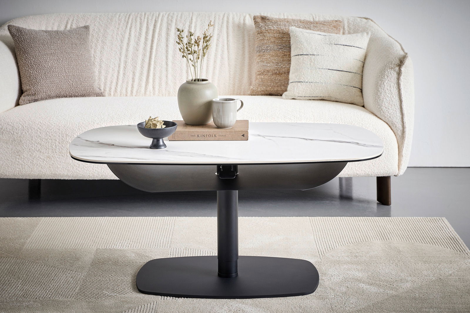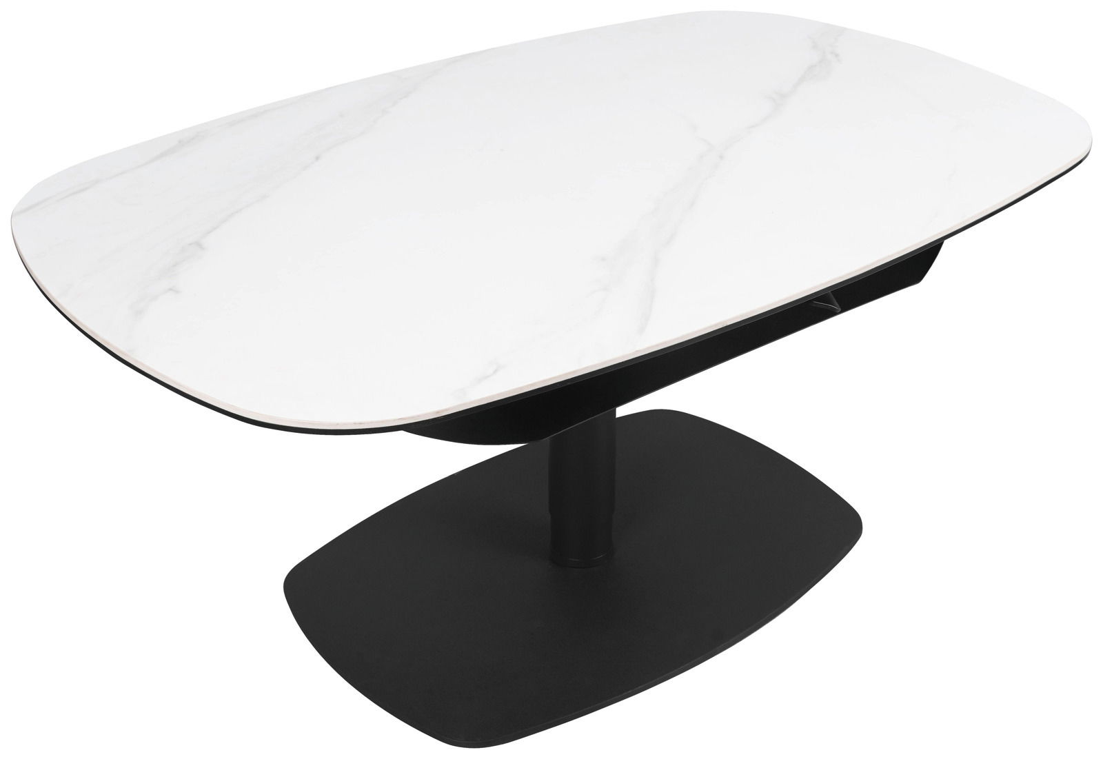 Der Dieter Knoll Couchtisch BRESCIA fasziniert mit seinem modernen und trendigen Design, das in jedem Wohnraum Akzente setzt. Die elegante, ovale Form und die klare Hauptfarbe Weiß verleihen diesem Möbelstück eine zeitlose Ästhetik. Die Oberplatte besticht durch eine innovative Kombination aus 6 mm Keramik auf einer ebenso dicken Glaskonstruktion, die bombiert ist und dadurch eine besondere optische Tiefe erzeugt. Mit einer Belastbarkeit von bis zu 30 kg und einem durchdachten Griff unter der Oberplatte, der eine Höhenverstellung bis zu 75 cm ermöglicht, vereint der Tisch Funktionalität mit herausragender Gestaltung. Ein Meisterwerk für Ihr Zuhause.