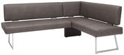 Auf dem glatten kaffeebraunen Polster (925-78 coffee) der Dieter Knoll Eckbank "PLAY" nimmt die Familie gern Platz. Den modernen Look der Bank prägen auch das silberfarbene Kufengestell in gebürsteter Edelstahloptik sowie die Distanzhalter in lackierter Buche-Optik.