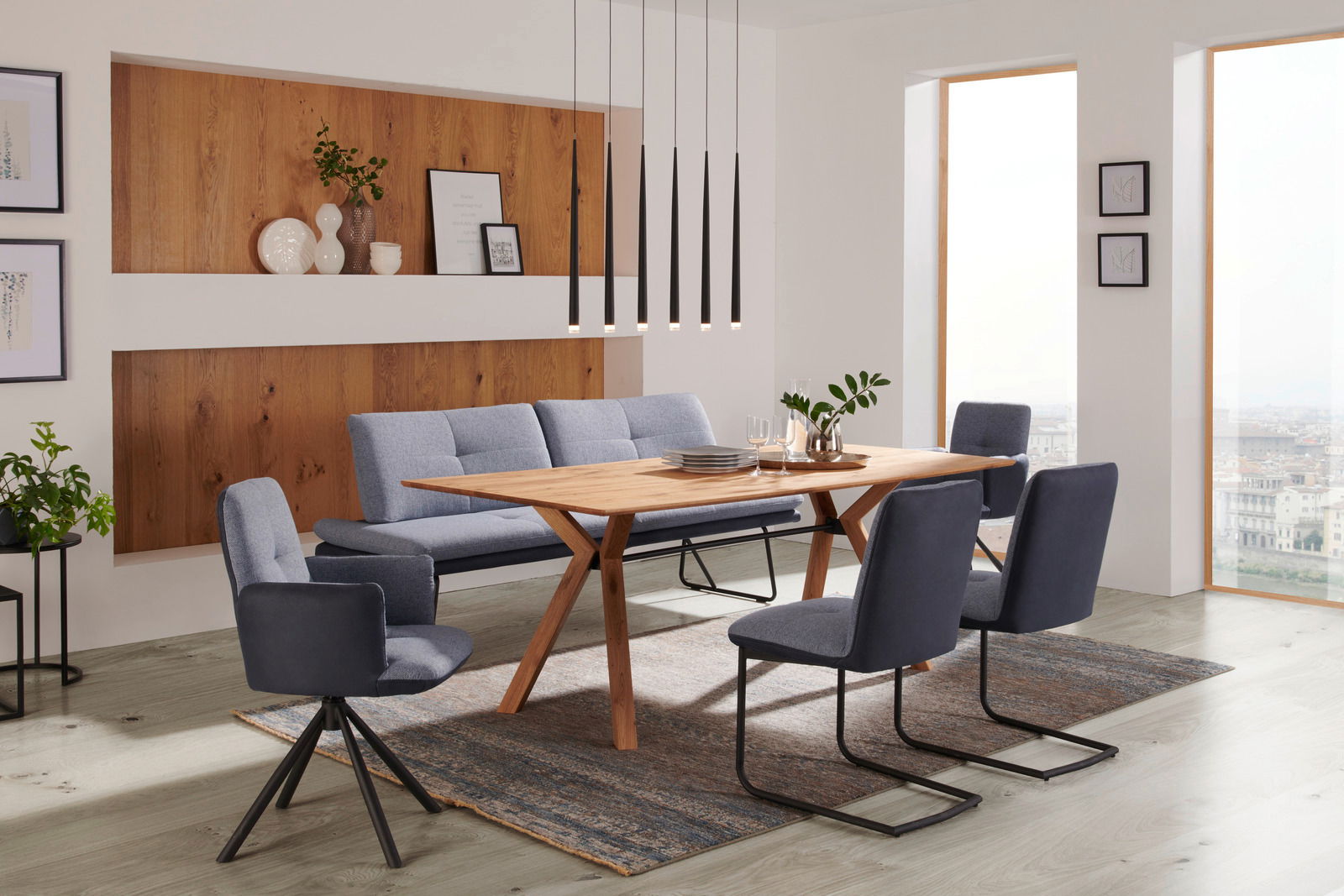 Ein durch und durch massives Stück ist der moderne Dieter Knoll Esstisch "MONDELLO". Die geölte Asteiche mit durchgehender Lamelle wirkt durch die Schweizer Dachkante und das Vierfußgestell mit schwarzer Metallstange nahezu dezent.