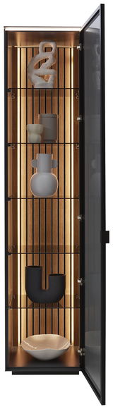 Entdecken Sie die elegante Dieter Knoll Vitrine RIANI, die mit ihrem modernen und trendigen Design ein echter Hingucker in jedem Raum ist. Die Vitrine besticht durch ihre anthrazit lackierte Front und den Korpus, die harmonisch mit der schwarz lackierten Griffleiste und dem Alurahmen kombiniert sind. Die Rückwand in schwarz natur verleiht dem Möbelstück zusätzliche Tiefe. Die Vitrine ist aus hochwertigem MDF-Material in Holz-Nachbildung gefertigt und überzeugt mit ihrer klaren, minimalistischen Formensprache. Die enthaltene LED-Oberboden- und Rückwandbeleuchtung setzt Ihre Lieblingsstücke gekonnt in Szene.
