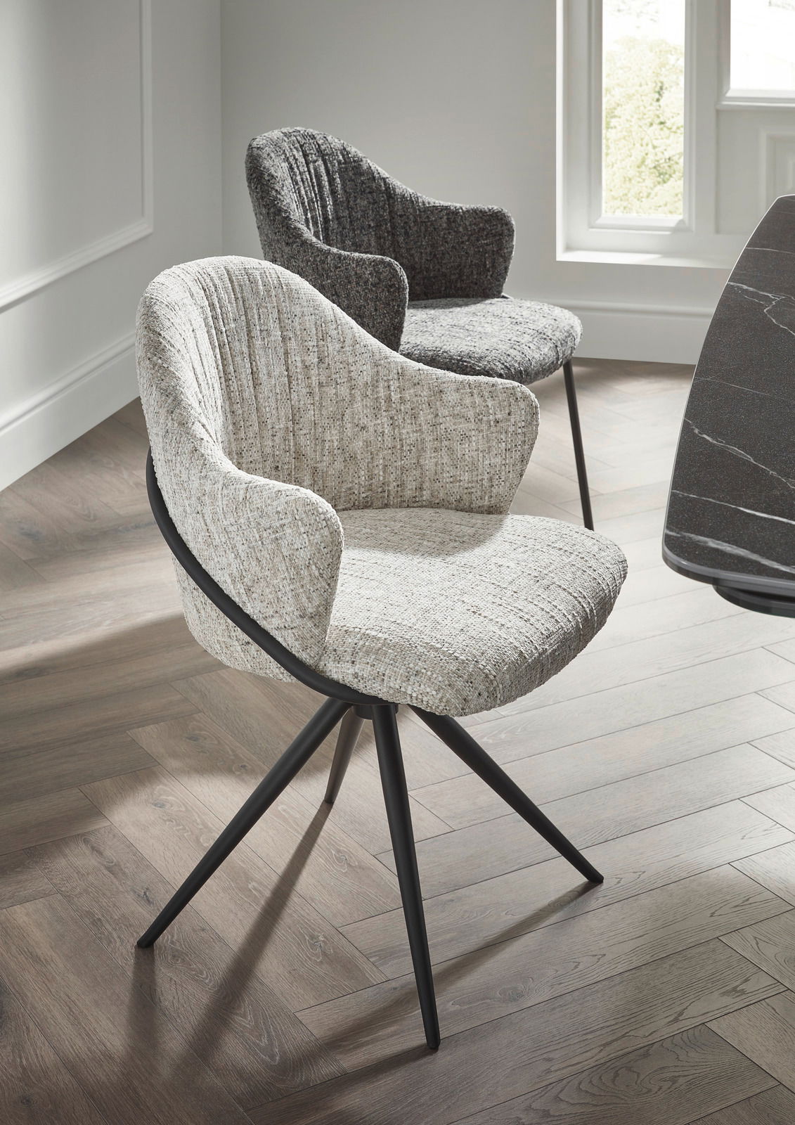 Emilio Belluti Armlehnstuhl MATTEO - Komfortabler Drehstuhl Die außergewöhnliche Qualität des Stuhls wird durch die beeindruckende Scheuertouren-Zahl von 70.000 unterstrichen, was für eine hohe Langlebigkeit des Materials spricht. Der Hauptstoff ist nicht nur robust, sondern auch angenehm weich, was den Sitzkomfort noch weiter erhöht. Das anthrazitfarbene Metallgestell verleiht dem Stuhl eine stabile Basis und betont das moderne Design. Ob im Esszimmer, Büro oder Wohnzimmer, der Emilio Belluti Armlehnstuhl MATTEO fügt sich harmonisch in jedes Ambiente ein. Gönnen Sie sich diesen stilvollen Hingucker und werten Sie Ihr Zuhause auf. Bestellen Sie jetzt!