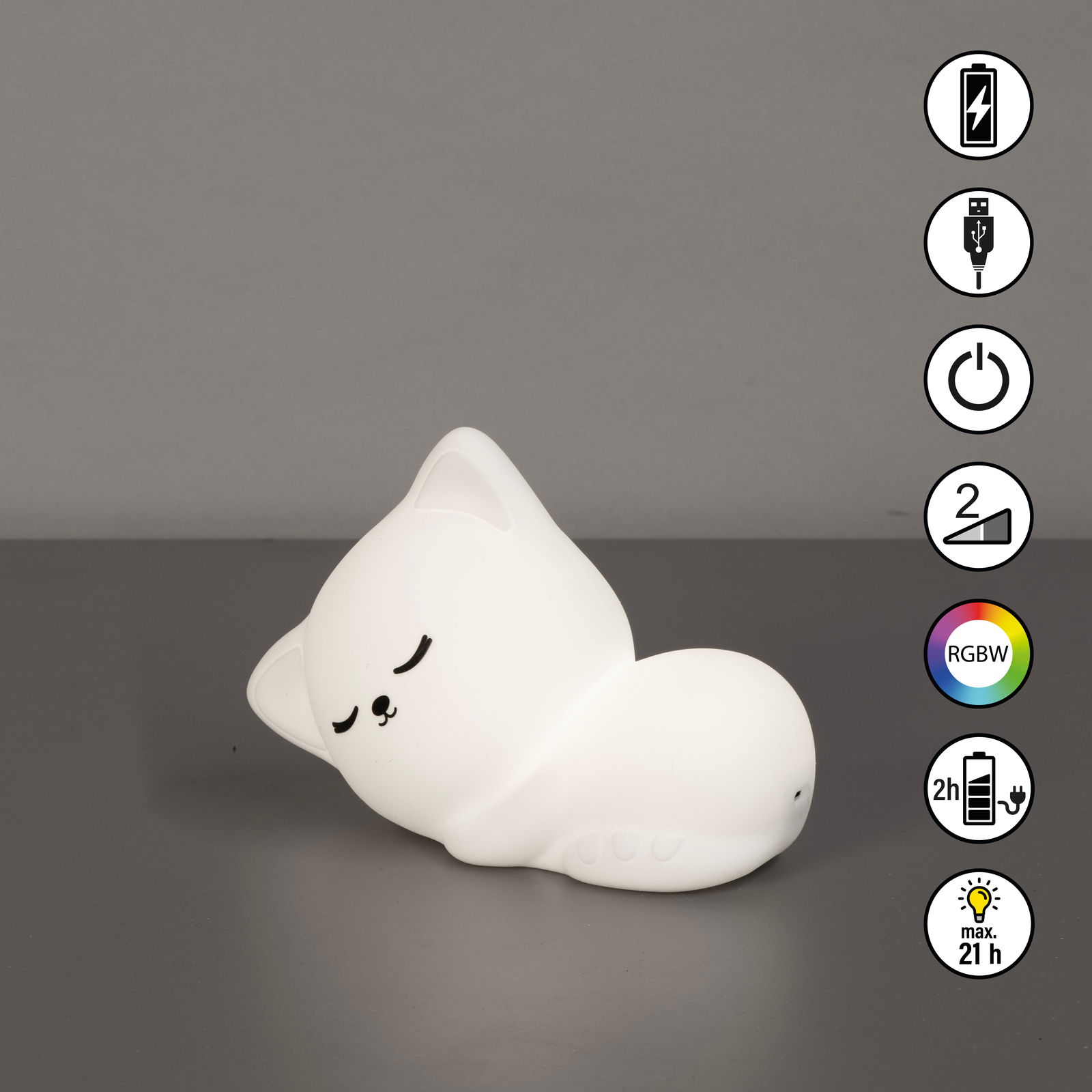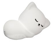 Entdecken Sie das FHL easy Akku-Nachtlicht Sleep Cat MIA, das mit seiner charmanten Katzenform und der Hauptfarbe Weiß jedes Schlafzimmer aufwertet. Die stufenlos einstellbare RGB-Lichtfarbe schafft eine individuelle Atmosphäre, während die Farbtemperatur von 3000K für ein warmes, einladendes Licht sorgt. Dank der LED-Technologie und einer Nennleistung von nur 0,3 W bietet dieses Nachtlicht eine energieeffiziente Lösung für sanfte Beleuchtung. Aus weichem Silikon gefertigt, ist es nicht nur langlebig, sondern auch sicher für Kinder. Der integrierte ON/OFF-Schalter macht die Bedienung kinderleicht, und das mitgelieferte USB-Kabel ermöglicht unkompliziertes Aufladen.