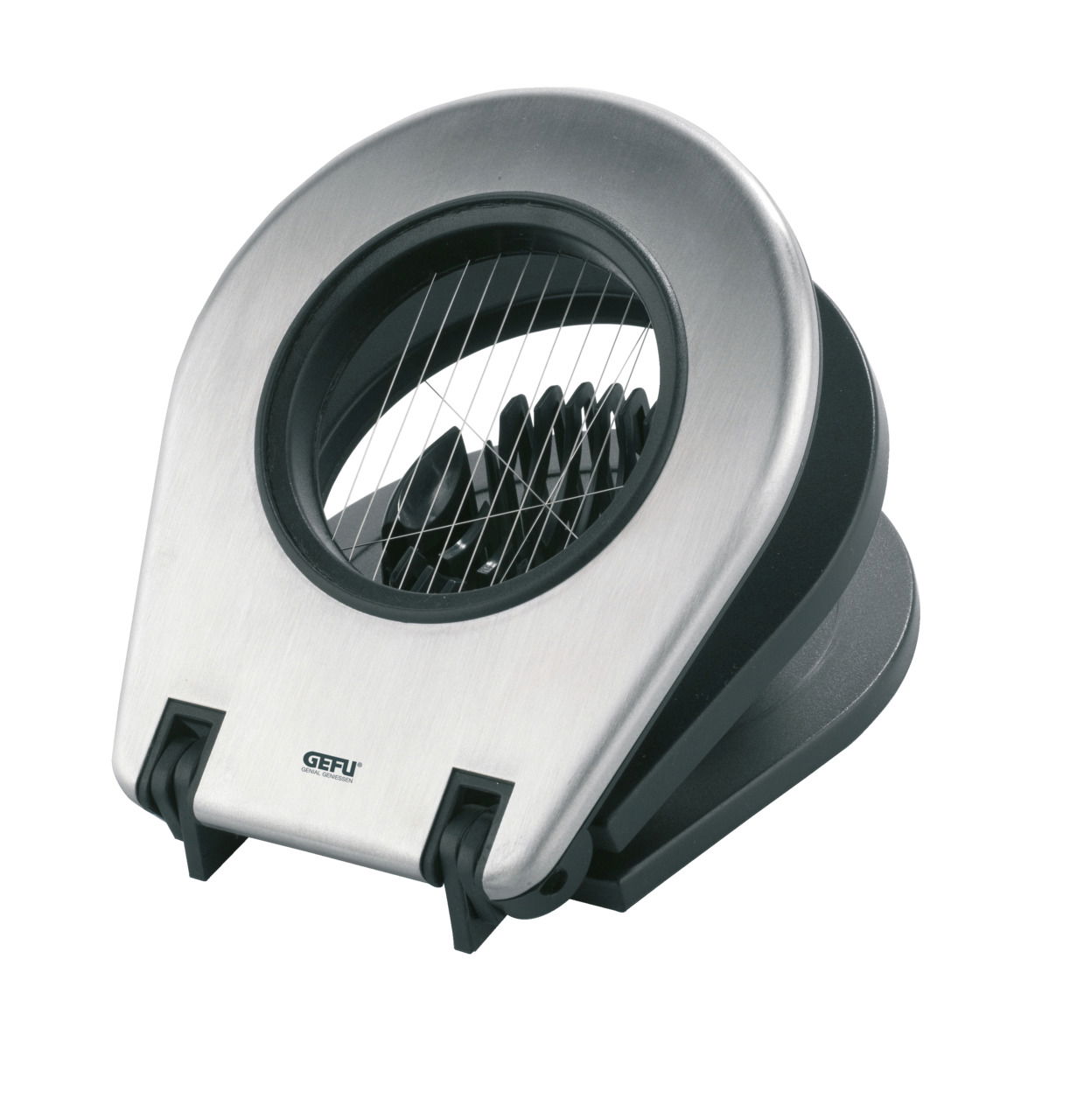Ob Spalten oder Scheiben, der Gefu Eierschneider "DUO" liefert Ihnen beides. Der B/H/T ca. 13 x 3 x 11 cm große Küchenhelfer aus schwarzem Kunststoff und Edelstahl ist spülmaschinenfest, besonders hochwertig verarbeitet und liefert Ihnen ein ausgezeichnetes Schneidergebnis.