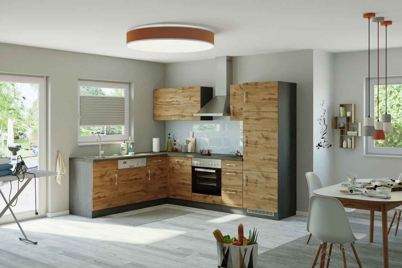 Mit einer Breite von ca. 210 cm und einer Tiefe von ca. 270 cm passt diese Küchenzeile optimal in größere Räumlichkeiten. Die Verarbeitung aus Holznachbildung ist robust und leicht zu pflegen. Eine Spüle ist im Lieferumfang enthalten. Freuen Sie sich auf die Held Möbel Küchenzeile SORRENTO!