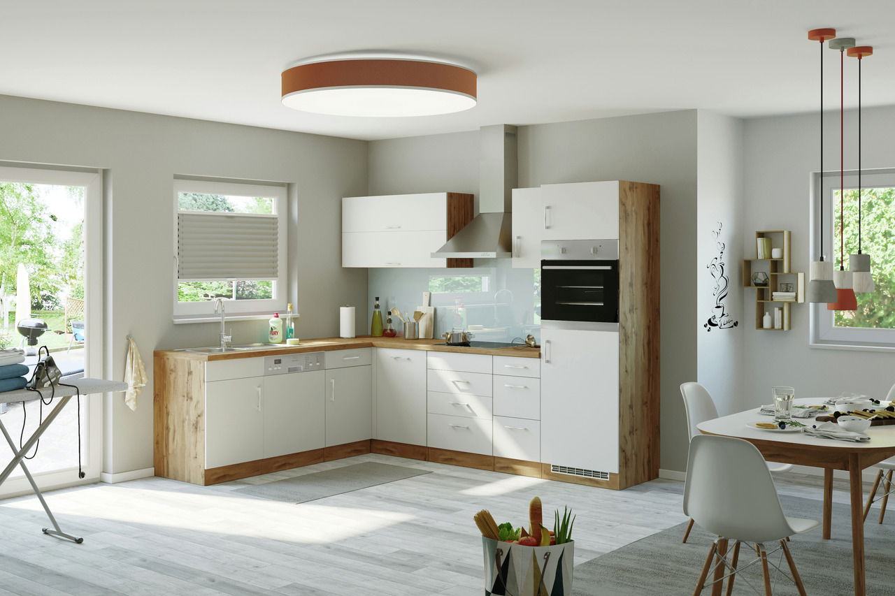 In strahlendem Weiß präsentiert sich die Held Möbel Küchenzeile SORRENTO. Die Fronten stechen sofort ins Auge und lassen sich mit jeglichen Böden kombinieren. Die eichefarbene Arbeitsplatte harmoniert wunderbar mit dem ebenfalls eichefarbenen Korpus.