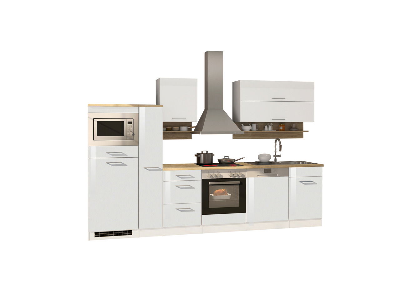 In strahlendem Hochglanzweiß präsentiert sich die Held Möbel Küchenzeile MAILAND. Die Fronten stechen sofort ins Auge und lassen sich mit jeglichen Böden kombinieren. Die eichefarbene Arbeitsplatte setzt sich wunderbar vom weißen Korpus ab.