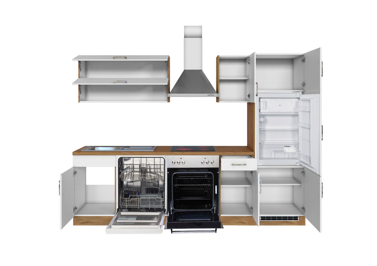 In strahlendem Weiß präsentiert sich die Held Möbel Küchenzeile SORRENTO. Die Fronten stechen sofort ins Auge und lassen sich mit jeglichen Böden kombinieren. Die eichefarbene Arbeitsplatte harmoniert wunderbar mit dem ebenfalls eichefarbenen Korpus.