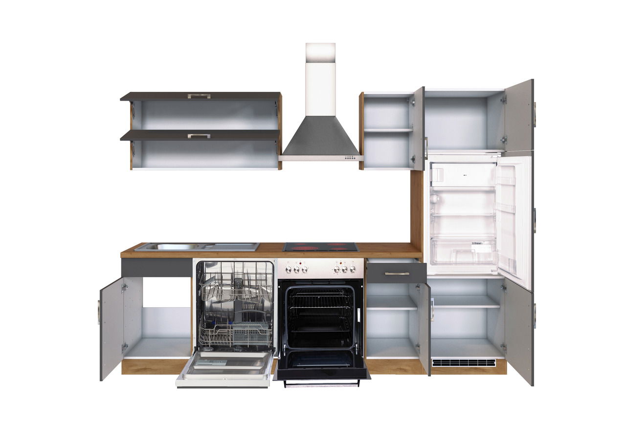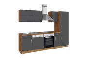 In schlichtem Anthrazit präsentiert sich die Held Möbel Küchenzeile SORRENTO. Die Fronten lassen sich mit jeglichen Böden kombinieren. Die eichefarbene Arbeitsplatte harmoniert wunderbar mit dem ebenfalls eichefarbenen Korpus.