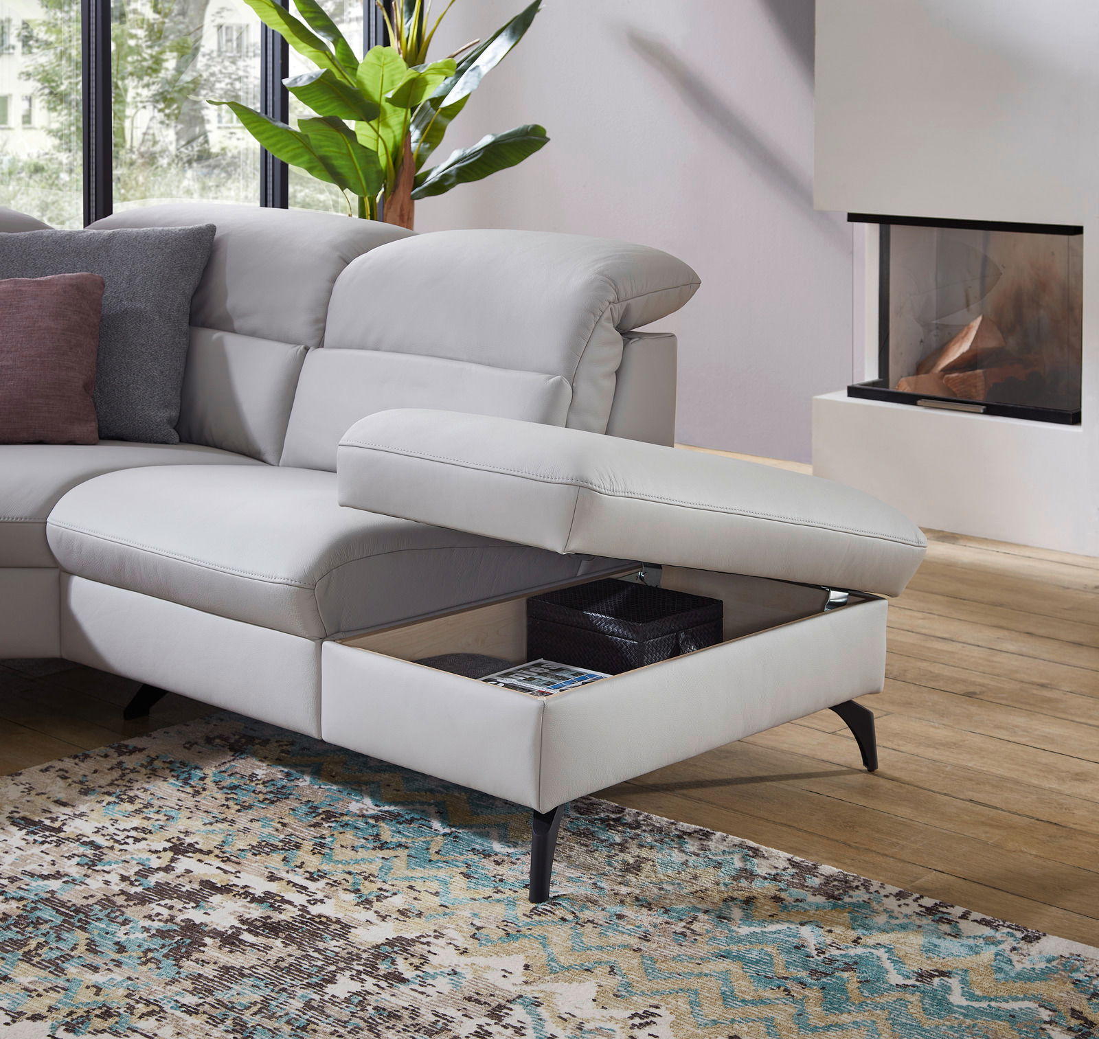 Die Himolla Eckgarnitur 1352 SPEKTRA: Mehr als nur ein SofaDie Himolla Eckgarnitur 1352 SPEKTRA ist mehr als nur ein Sofa. Es ist ein 3er Sofa mit Armteil links, einem Eckelement mit Hocker und praktischem Stauraum rechts. Die pulverbeschichteten Füsse verleihen dem Sofa eine zusätzliche Note von Eleganz und Stärke. Das Besondere an diesem Modell ist die manuelle Kopfteilverstellung, die es ermöglicht, Ihre persönliche Komfortzone individuell anzupassen. Geniessen Sie den Luxus von Leder und das schicke, moderne Design, das perfekt in jedes Zuhause passt. Verpassen Sie nicht die Chance, Ihrer Wohnkultur ein neues Level an Stil und Komfort zu verleihen. Erleben Sie die Himolla Eckgarnitur 1352 SPEKTRA und geniessen Sie den Unterschied.