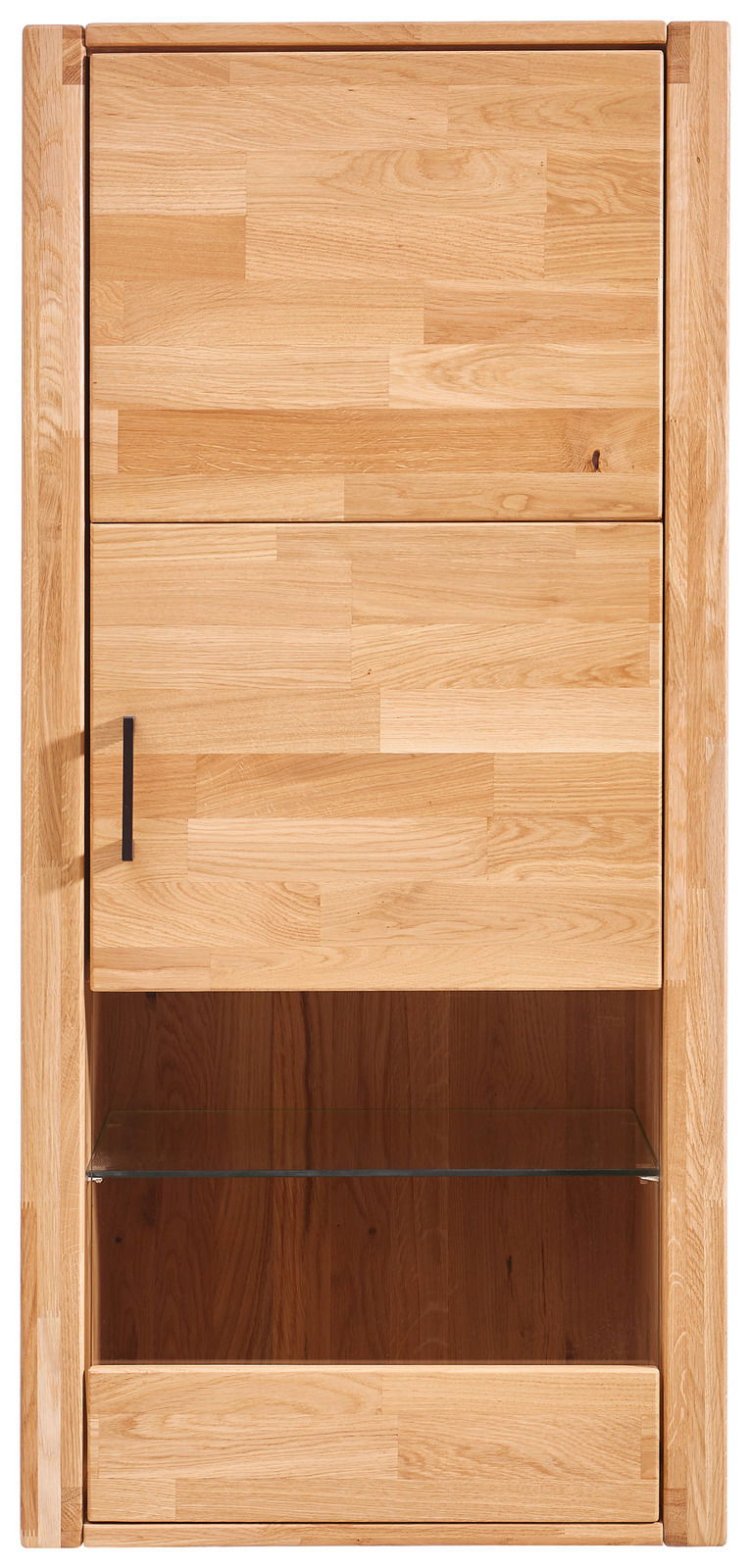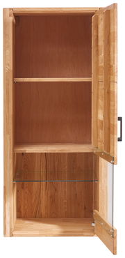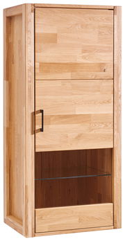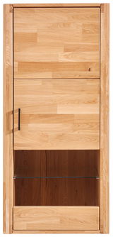 Hängevitrine mit Softclose-HolztürOb Flur, Wohn- oder Essbereich die B/H/T ca. 55 x 110,8 x 38 cm große Vitrine passt in jede Nische. Die geölten Wildeiche-Fronten bestehen aus keilverzinkten Lamellen (18 mm) und werden von Eichenstollen (50 x 50 mm) umrahmt. Für Übersicht im Schrankinneren sorgen 2 Holzböden sowie 1 Glasboden. Holen Sie die Hom´in Hängevitrine "BROOKLYN"!