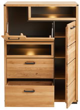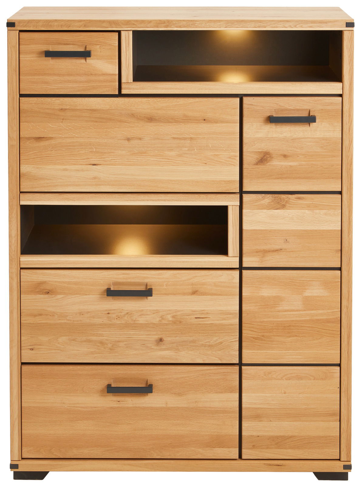 Das B/H/T ca. 105 x 143 x 38 cm große Modell präsentiert sich kompakt und mit viel Ordnungsfläche. In einer Holztür, einer Klappe, zwei offenen Fächern und zwei Softclose-Schubkästen mit Selbsteinzug sortieren Sie Hausrat und Deko. Behagliche Lichtakzente setzen die integrierten LED-Beleuchtungen. Robuste Metallgriffe und Holzfüße ergänzen die teilmassive Fertigung (74 kg). Nehmen Sie das Hom´in Highboard "GENUA"!
