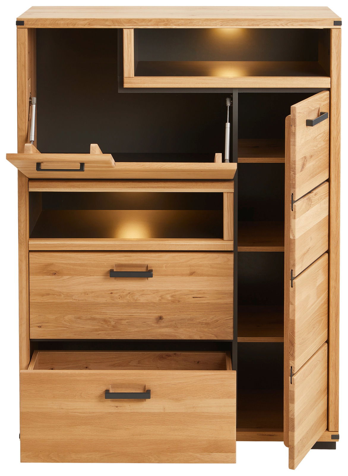 Mit einem Korpus aus hellbrauner Artisan-Eiche-Nachbildung und graphitfarbenen Absetzungen besticht das Hom´in Highboard "GENUA" durch attraktives Landhausflair. Die Front aus massiver Wildeiche mit durchgehender Lamelle sorgt für rustikalen Charme.