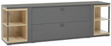Das Hom´in Tv-Lowboard MAGOLO präsentiert sich als stilvolles Möbelstück, das modernes Design mit Funktionalität vereint. In einem eleganten Grauton gehalten, fügt sich dieses Lowboard nahtlos in jedes zeitgemäße Wohnambiente ein. Die Kombination aus grauem Korpus und Front sowie die Absetzung in Eiche Artisan Nachbildung verleihen dem Möbelstück eine besondere Note. Ausgestattet mit zwei praktischen Schubladen, bietet es ausreichend Stauraum für Ihre Multimedia-Geräte und Zubehör. Die Bügelgriffe unterstreichen das moderne Design und erleichtern die Handhabung. Gefertigt aus hochwertiger Holznachbildung, überzeugt das Lowboard durch Langlebigkeit und Robustheit.