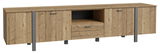 TV-Lowboard mit InnenaufteilungDie pflegeleichte Holznachbildung mit pulverbeschichtetem Metallgestell unterstützt die gleichnamige Möbelserie. Ihr B/H/T ca. 203 x 50 x 42,3 cm großes Stellmaß (Gewicht 45 kg) ergänzt als Solobeisteller kleine Raumbereiche. Die Ablagefläche bietet dem Smart-TV Platz. Technische Begleitgeräte finden im Staufach, dem Schubkasten sowie hinter vier Türen ausreichend Ordnungsflächen. Kaufen Sie das Hom´in TV-Lowboard "MANHATTAN"!