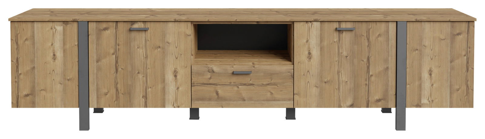 Das Hom´in TV-Lowboard "MANHATTAN" vermittelt modernen Landhauseinrichtungen nordischen Cottagecharme. Sein geradliniger Korpus sowie die Fronten zeigen sich im hellbraunem Bramberg-Fichten-Dekor. Graue Metalldetails von Rahmengestell und Griffstücken bieten industriebezogene Akzente.