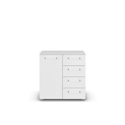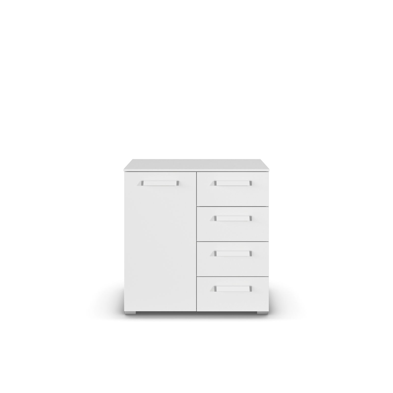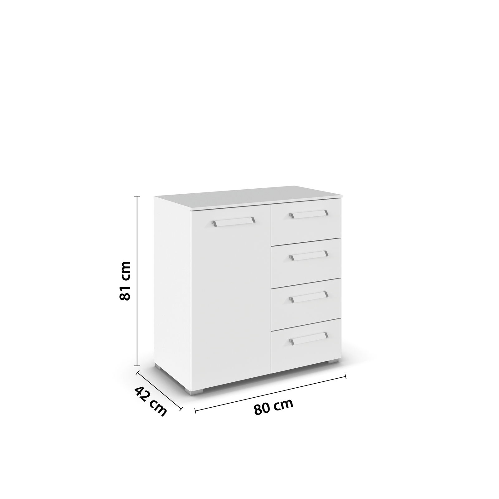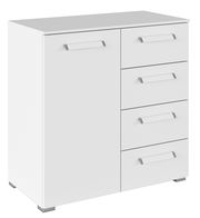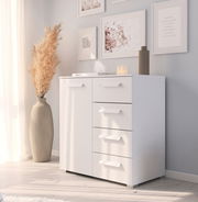 Die Intro Kommode Rudi vereint modernes Design mit praktischer Funktionalität und ist die perfekte Ergänzung für jedes stilvolle Zuhause. Mit ihrer eleganten weißen Front und dem weißen Korpus fügt sie sich nahtlos in moderne Einrichtungskonzepte ein. Diese Kommode bietet großzügigen Stauraum mit einer Tür und vier Schubladen, ideal zur Organisation Ihrer persönlichen Gegenstände. Die Verwendung von hochwertiger Holznachbildung sorgt für Langlebigkeit und eine ansprechende Ästhetik. Dank der Softclose-Funktion schließen die Türen und Schubladen sanft und leise, was den täglichen Komfort erhöht. Dieses Möbelstück wird in Deutschland gefertigt und steht für höchste Qualität und Präzision.