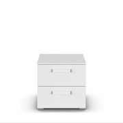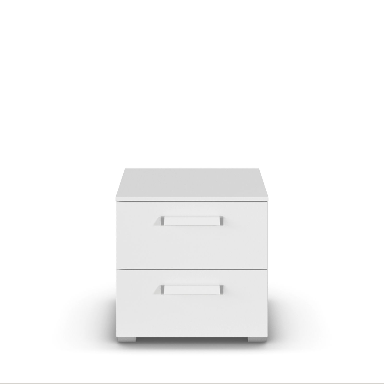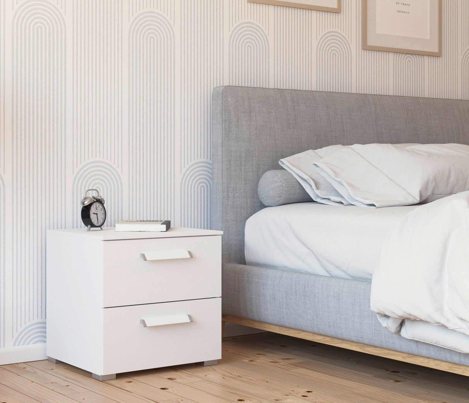 Verleihen Sie Ihrem Schlafzimmer mit dem Nachttisch Rubi Intro einen Hauch von modernem Stil und Eleganz. Dieser Nachttisch besticht durch sein zeitloses Design in reinem Weiß und fügt sich nahtlos in jeden Raum ein. Die klare Linienführung und die Griffe an den beiden Schubladen unterstreichen das minimalistische Konzept, während die Holznachbildung als Hauptmaterial für eine ansprechende Ästhetik sorgt. Mit zwei geräumigen Schubladen bietet der Nachttisch ausreichend Stauraum für Ihre persönlichen Gegenstände und sorgt für Ordnung neben Ihrem Bett. Hergestellt in Deutschland, garantiert er langlebige Qualität und stilvolle Funktionalität.