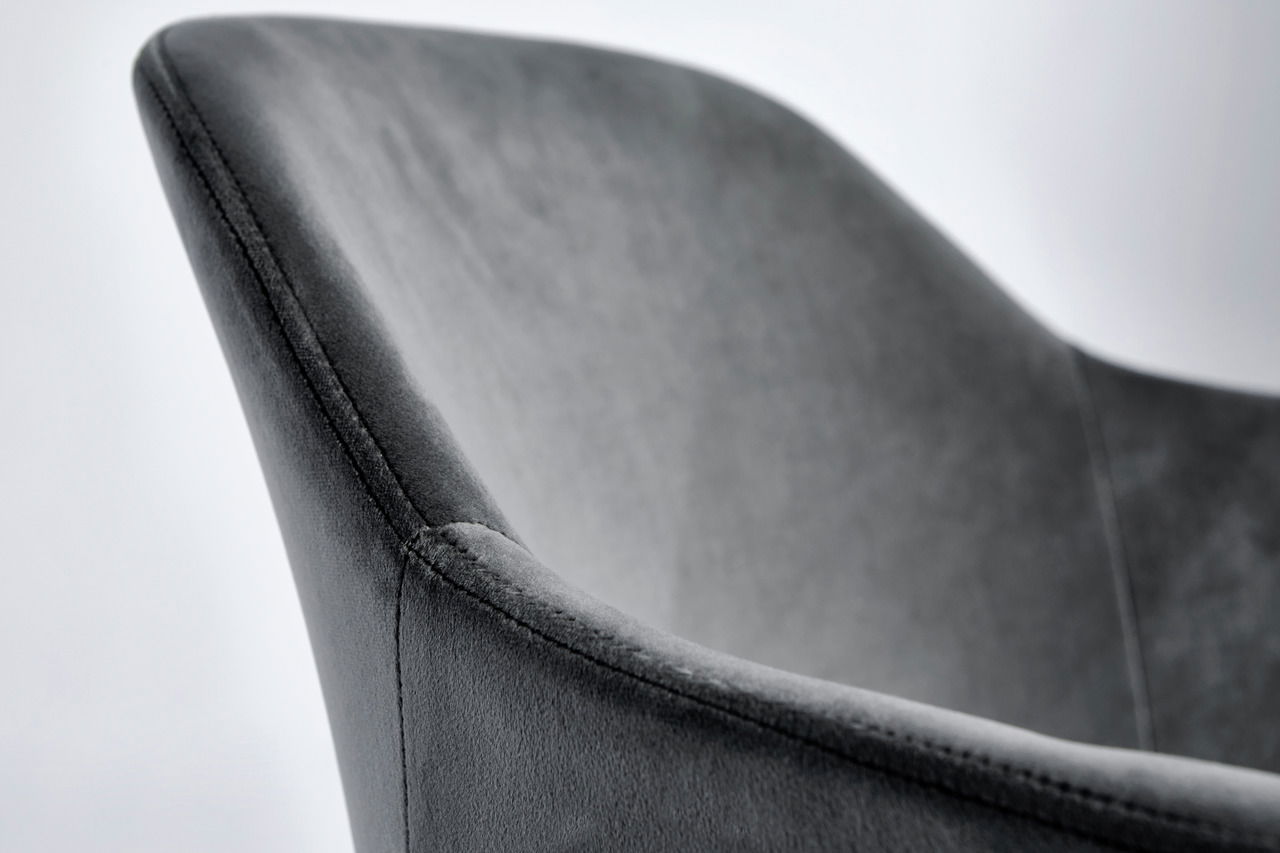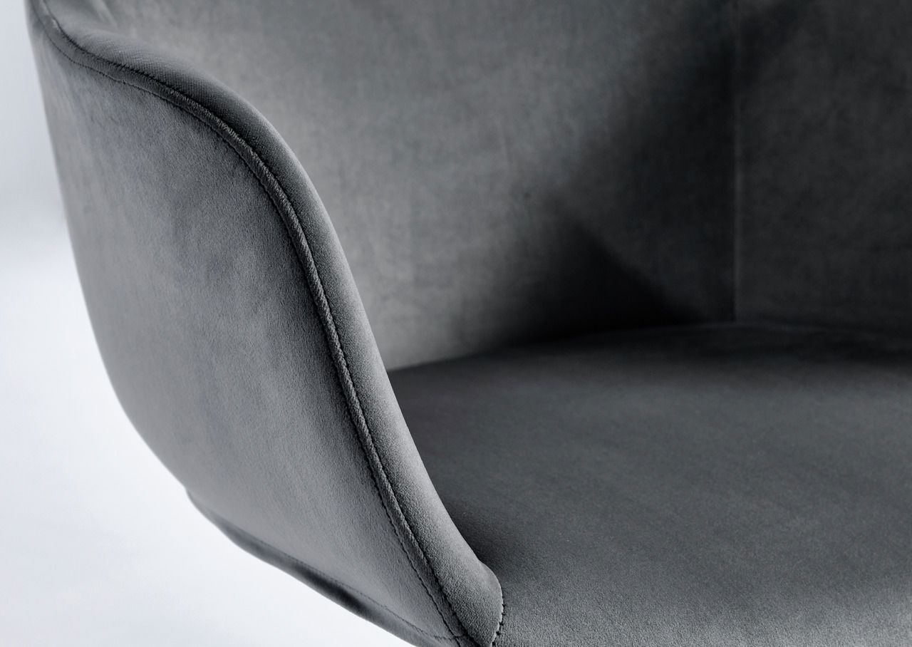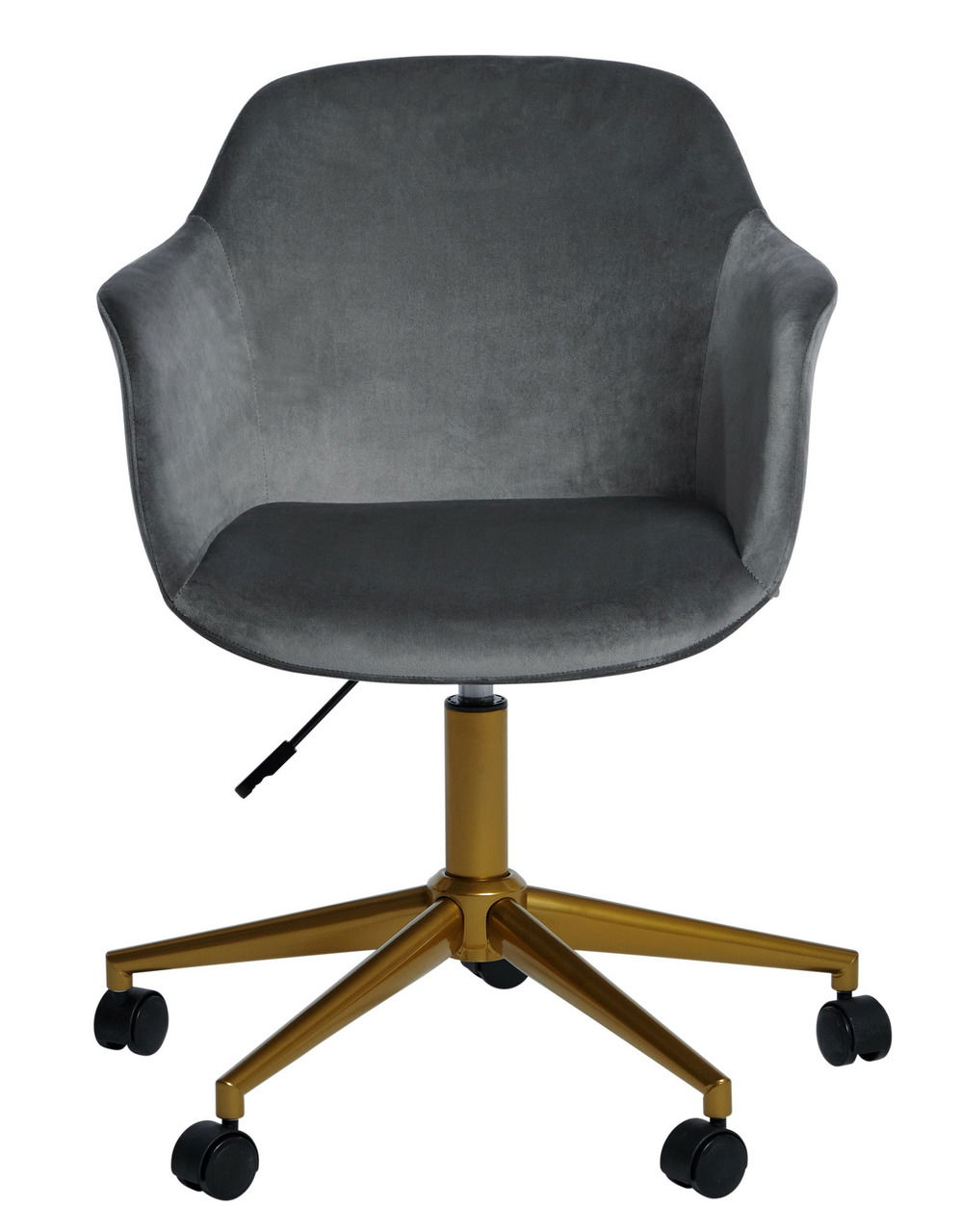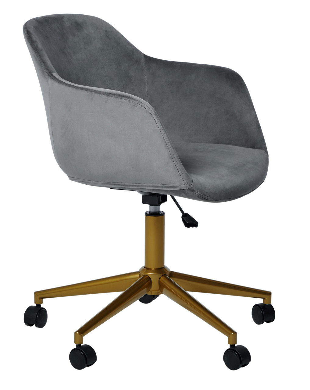 Mit dem Jahnke Bürostuhl "SHELL" erhält Ihr Office einen stilvollen Arbeitspartner. Als extravaganter Blickfänger dient das beschichtete Drehkreuz in Gold. Die mit grauem Samt bezogene Sitzschale betont das elegante Gesamtkonzept.