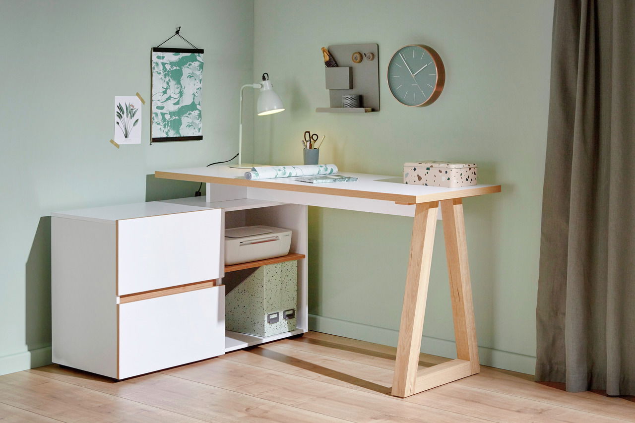 In der puristisch inspirierten nordischen Wohnkultur macht der Jahnke Eckschreibtisch "CLUB" einen aufgeräumten Eindruck. Sein Korpus und die Fronten in Mattweiß wirken elegant und erhalten durch die Kerneiche-Absetzungen des Gestells einen einladenden Akzent.