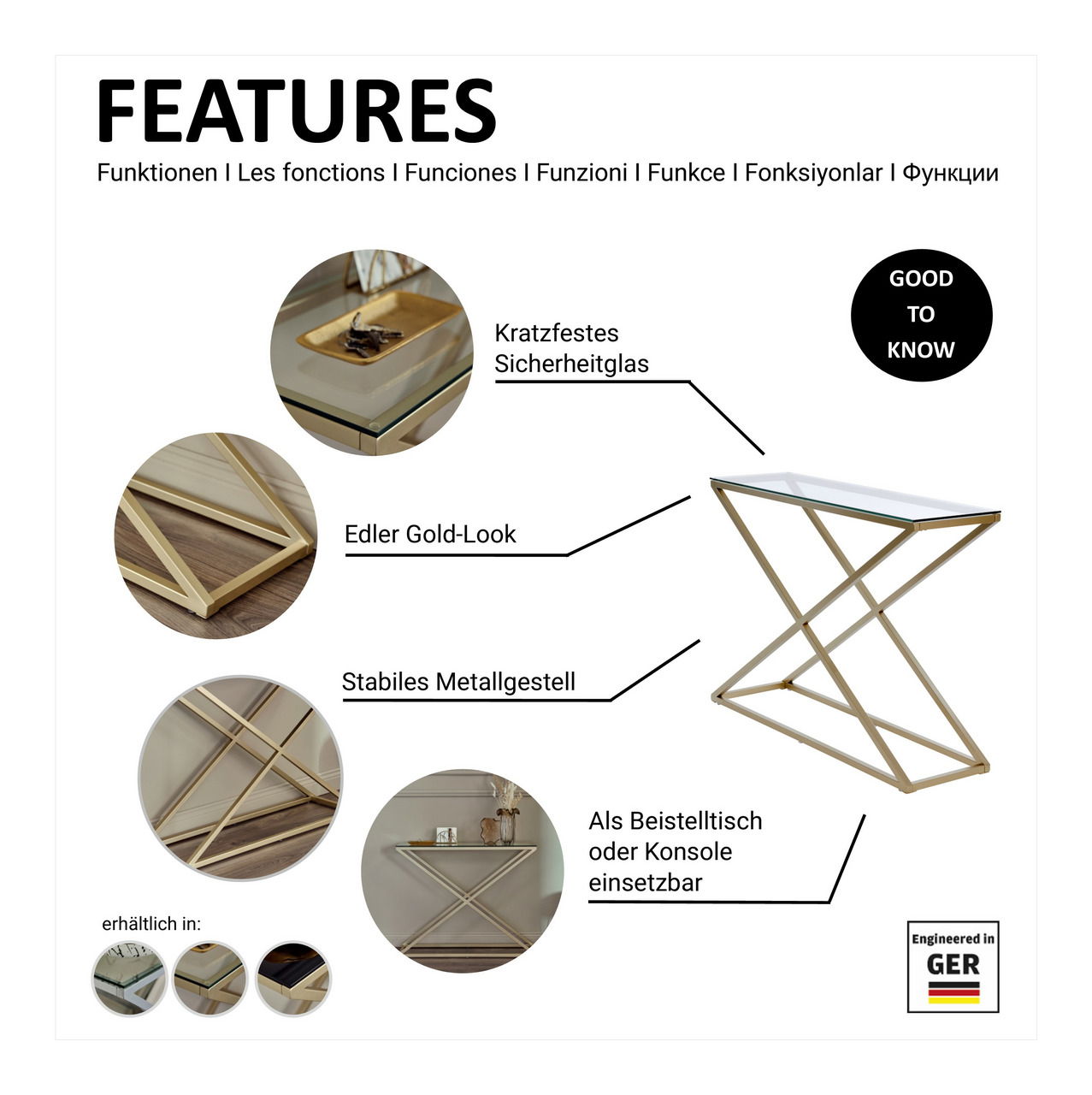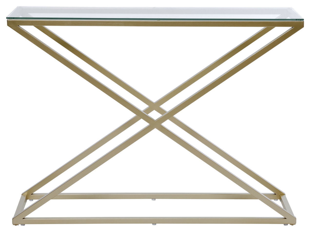 Gehobenes Einrichtungsambiente erhält mit der Jahnke Konsole "X-TRA D 140" einen exklusiven Raumpartner. Das glamouröse Gesamtbild setzt sich aus der ins goldene X-Gestell aus Metall eingefassten Klarglasplatte zusammen.