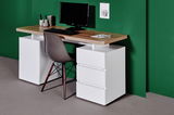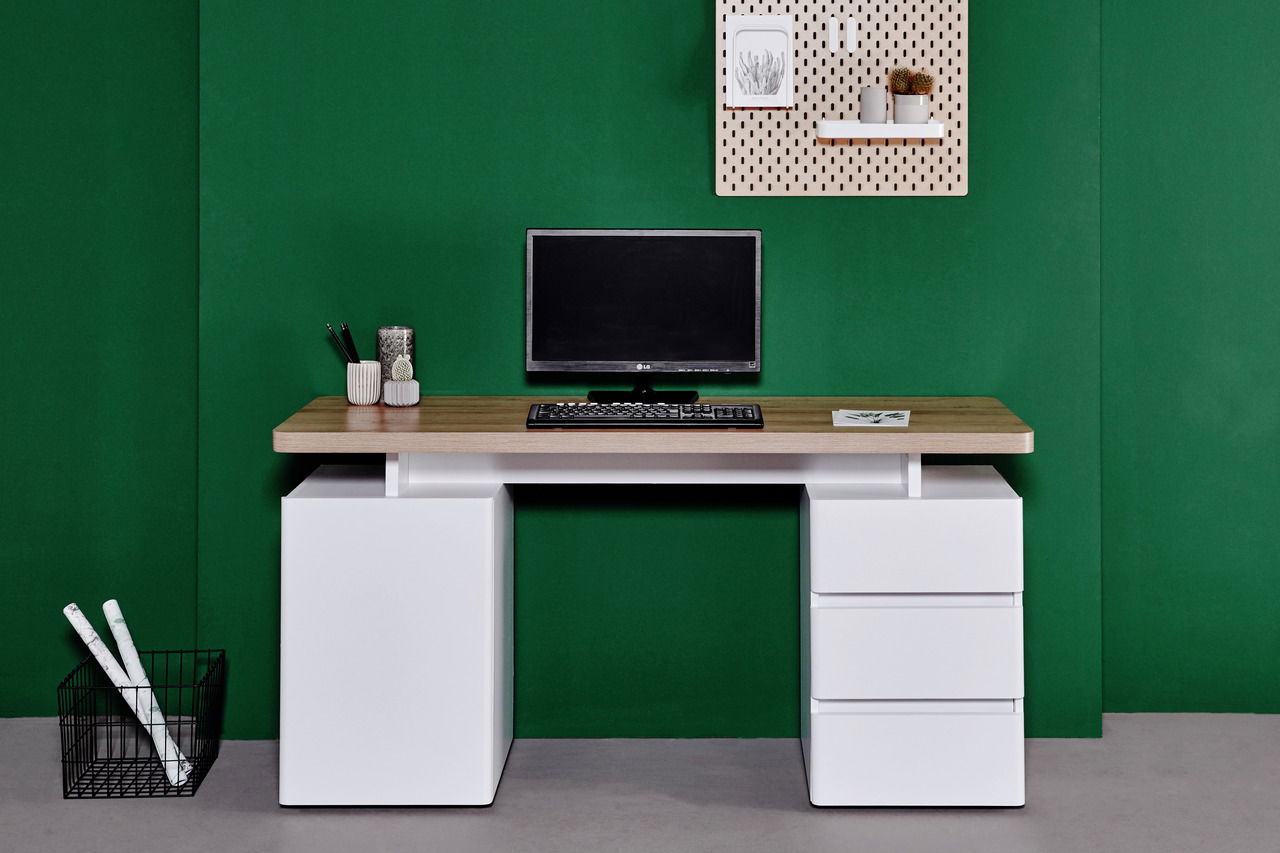 Der Jahnke Schreibtisch "CUUBA LIBRE" fügt sich harmonisch ins nordische Wohnkonzept ein. Sein geradliniges Erscheinungsbild mit weißem Korpus und Fronten und einer Tischplatte in warmem braunem Riviera-Eiche-Dekor wirkt puristisch elegant.