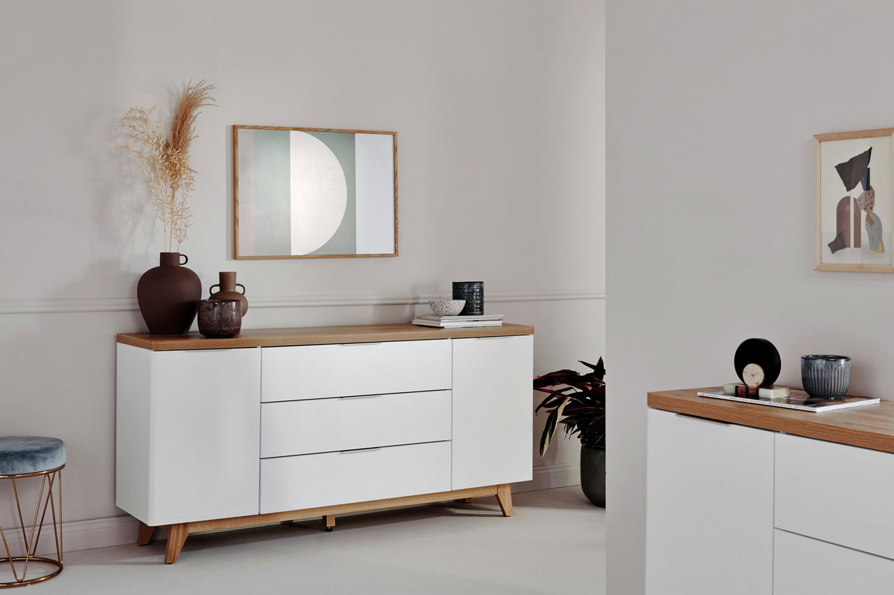 Das Jahnke Sideboard "LIBRE" unterstützt Ihr modernes Skandiambiente. Sein geradliniger Korpus und die Fronten in Mattweiß ergeben mit den braunen Kerneiche-Absetzungen von Oberplatte, Gestell und Griffleisten ein elegantes Designkonzept.