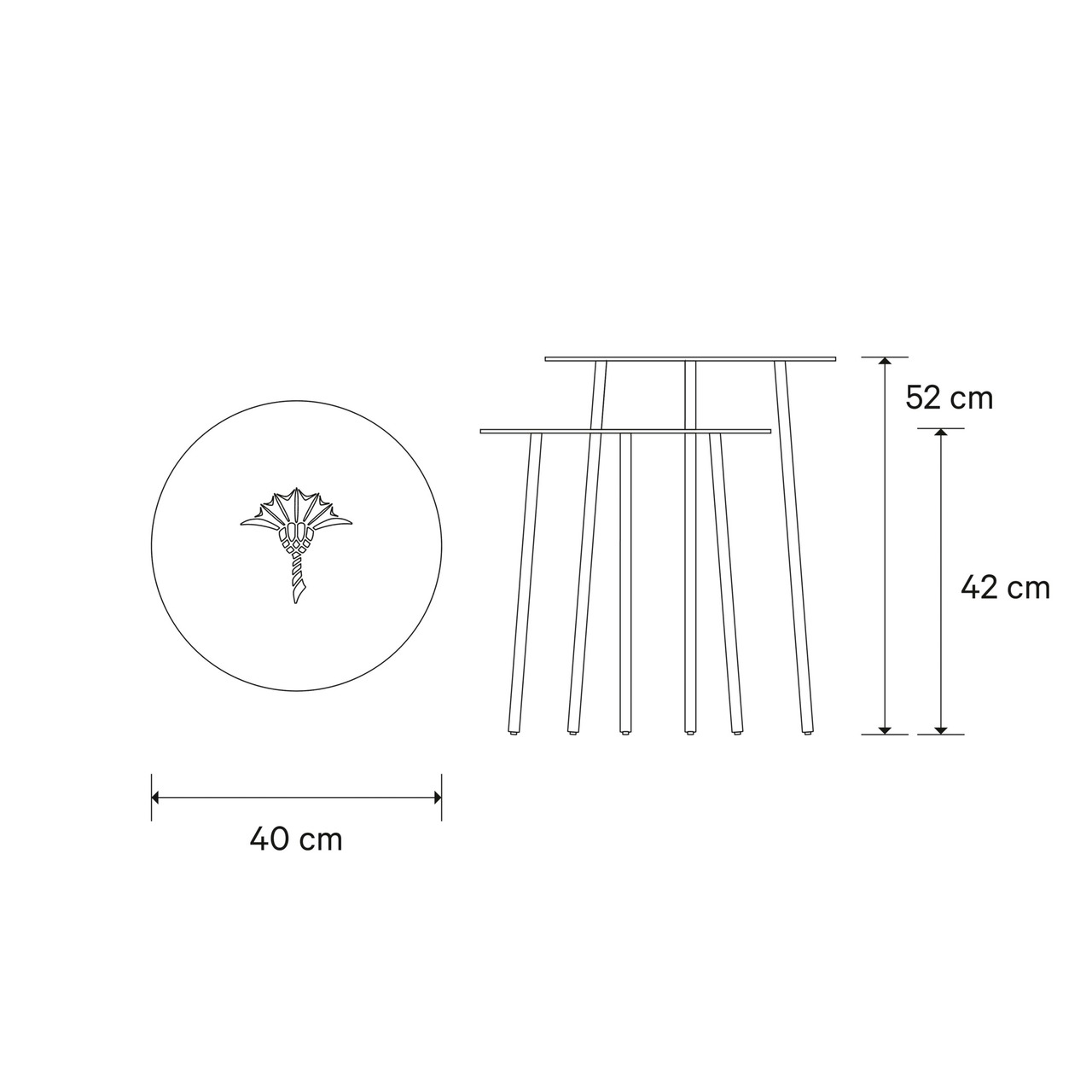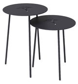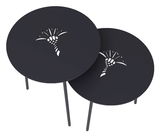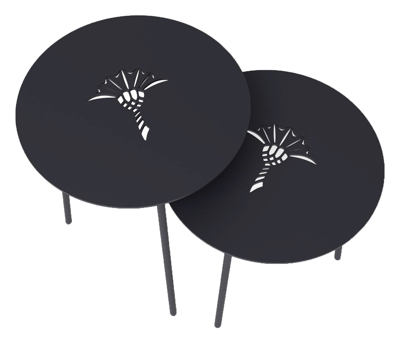 Die puristische Formsprache des runden Joop 2er-Satztischs "JOOP EMBOSS" unterstützt klar definierte Wohnkonzepte. Aus nachtblau gepulvertem Metall gefertigt, bietet das mit dem Laser mittig ausgeschnittenem Kornblumen-Logo einen exklusiven Hingucker.