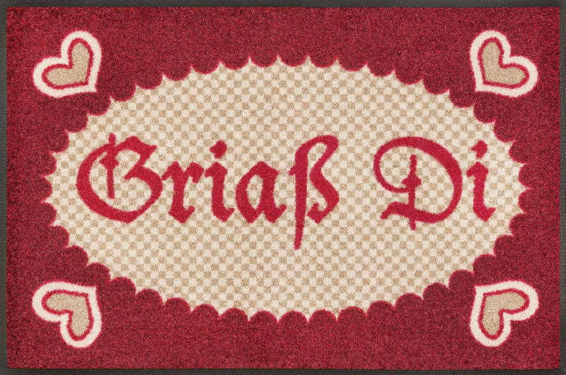 Die rote Fußmatte "Griaß Di" von Kleen-Tex begrüßt Ihre Gäste und Besucher auf das Herzlichste. Mit dem bayrischen Gruß zaubern Sie auch bei Nichtbayern ein Lächeln auf die Lippen. Die Matte ist dank ihres Materials aus 100 % Polyamid und der Rückseite aus 100 % Nitrilgummi rutschfest, pflegeleicht und langlebig. Mit den Maßen B/H/T von ca. 50 x 0,7 x 75 cm setzen Sie den Vorleger auch bei wenig Platz ein. Begrüßen Sie Ihre Gäste herzlich mit der Fußmatte "Griaß Di" von Kleen-Tex!