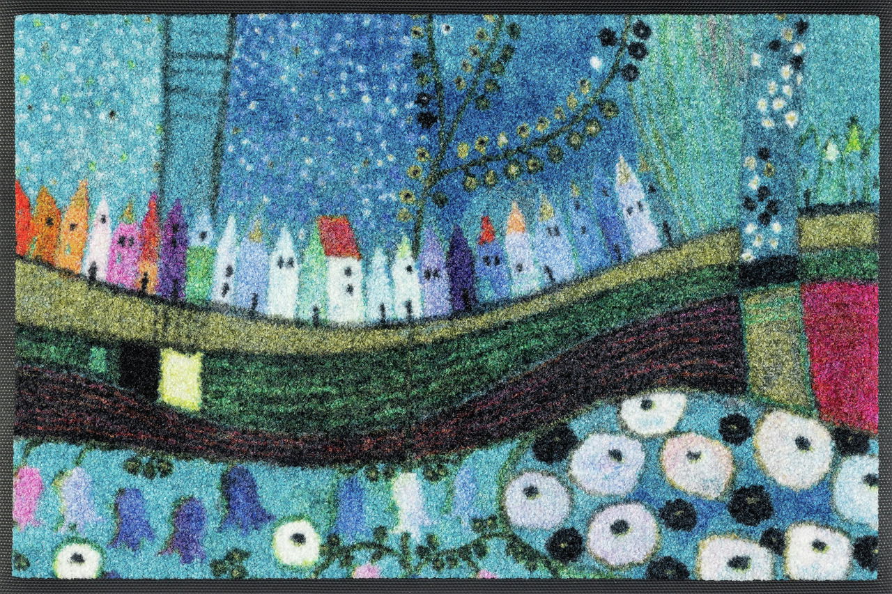 Die Kleen-Tex Fußmatte "STADT IN BLAU" zeigt eine gemalte Kette von Häusern inmitten einer naiv gestalteten Landschaft. Durch die strapazierfähige Polyamid-Oberfläche ist das Modell schmutzabweisend und liegt dank seiner Nitrilgummirückseite rutschsicher. Das gefällige L/B/H ca. 60 x 40 x 0,7 cm große Liegemaß passt wunderbar zu Nebeneingangstüren sowie vor einen Balkonzugang. Die Unterlage lässt sich einfach in der Maschine bis 60 °C waschen und ist bis 90 °C trocknerfest. Schnappen Sie sich die Kleen-Tex Fußmatte "STADT IN BLAU"!