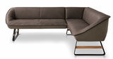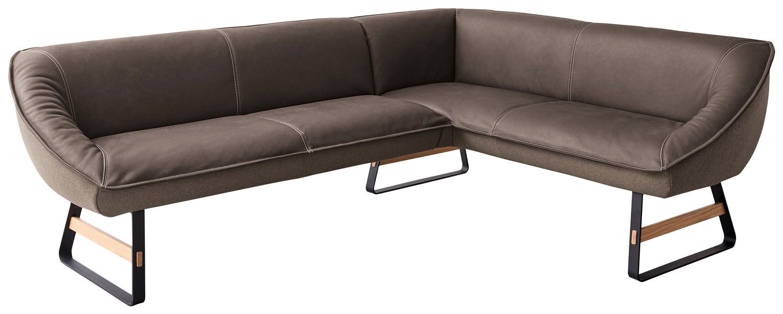 Die Koinor Eckbank SOFTY verbindet modernes Design mit hochwertigen Materialien und sorgt für ein stilvolles Ambiente in Ihrem Zuhause. Die Sitz- und Rückenfläche sind mit edlem Leder India in der Farbe Schoko bezogen, während das Sitz- und Rückenspannteil mit dem hochwertigen Stoff LODEN ausgestattet ist. Die Kombination aus Flachstahlkufe in Schwarz matt und massiver Wildeiche natur verleiht der Eckbank eine elegante und zugleich robuste Erscheinung. Mit einer komfortablen Sitzhöhe von 54 cm und einer Sitztiefe von 50 cm bietet die Eckbank einen optimalen Sitzkomfort. Der Rücken ist echt bezogen und die Unterfederung besteht aus langlebigen Wellenfedern.