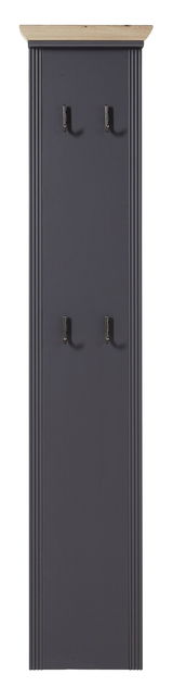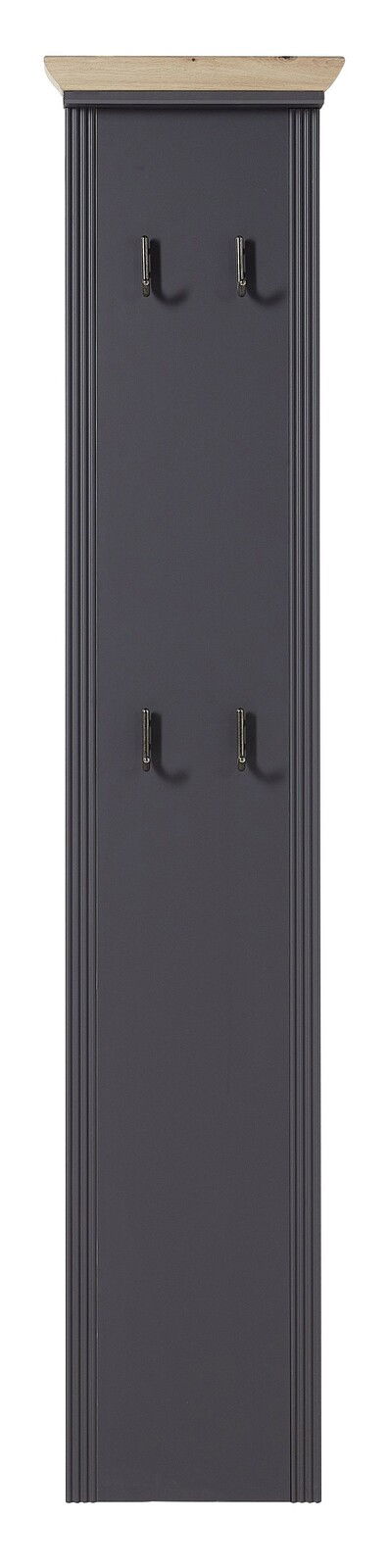 Mit dem Landscape Garderobenpaneel schmal "JUDITH" setzen Sie landhausbezogene Akzente im Hausflur. Es kombiniert grafitgraues Dekor mit einer Absetzung in hellbrauner Artisan-Eiche. Haken aus antikfarbigem Metall runden das harmonische Design ab.