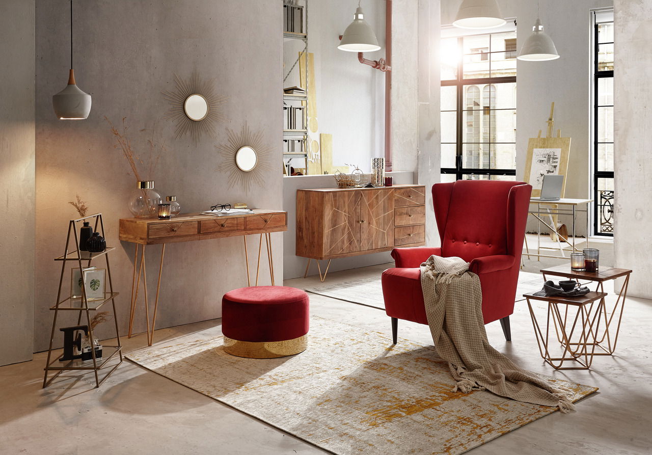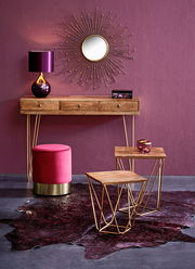Für ein urgemütliches Raumambiente sorgt der Landscape Konsolentisch "SCAN". Mittelbraunes Mango-Echtholz kombiniert sich mit goldfarbenen Einfräsungen, Füßen und Griffen zu einem harmonischen Landhausstil.