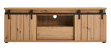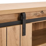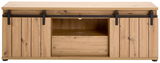 Das Landscape Lowboard BARRY bringt modernen Stil und zeitgemäße Eleganz in Ihr Zuhause. In einem warmen Eichenton gehalten, fügt sich das Lowboard harmonisch in jede Einrichtung ein und strahlt natürliche Schönheit aus. Die schwarz pulverbeschichteten Metallteile setzen dabei stilvolle Akzente und verleihen dem Möbelstück eine besondere Note. Gefertigt aus hochwertiger MDF-Nachbildung, bietet das Lowboard eine robuste und langlebige Lösung für Ihr Wohnzimmer. Mit zwei Türen und einer praktischen Schublade ausgestattet, bietet es ausreichend Stauraum, um Ihre Mediengeräte und andere Gegenstände ordentlich zu verstauen.