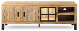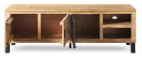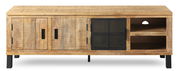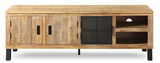 Entdecken Sie das charmante Landscape Lowboard KALI, das mit seinem Landhausstil und der eleganten Mangoholz Latte Design begeistert. Die Kombination aus einem schwarzen Fuß und braunen Front- und Korpuselementen verleiht diesem Möbelstück eine warme und einladende Ausstrahlung. Gefertigt aus hochwertigem Echtholz, strahlt das Lowboard Natürlichkeit und Beständigkeit aus. Die drei Drehtüren bieten großzügigen Stauraum und werden durch stilvolle Griffe ergänzt, die das Gesamtbild harmonisch abrunden. Die integrierte Beleuchtung setzt das Lowboard gekonnt in Szene und schafft eine gemütliche Atmosphäre in Ihrem Wohnraum.
