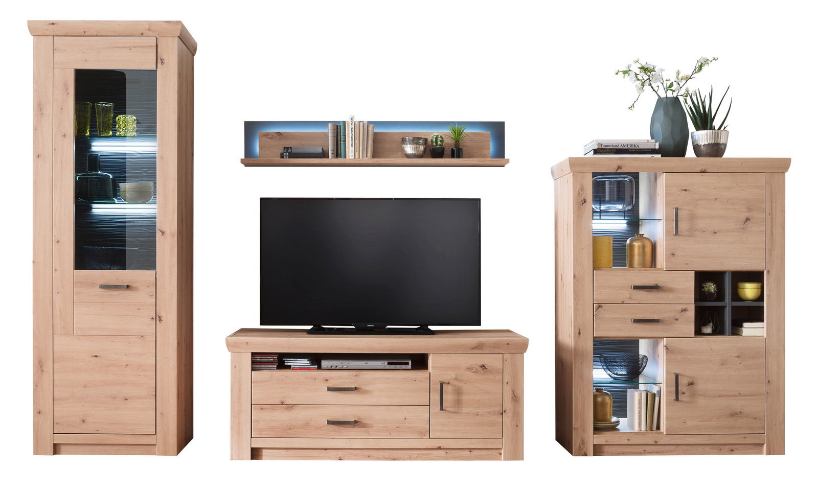 Wandkombination BRUNECK: Funktionalität trifft auf Eleganz Die Landscape Wandkombination BRUNECK besticht durch ihre durchdachte Ausstattung. Mit vier Türen und vier Schubladen bietet sie ausreichend Stauraum für Ihre persönlichen Gegenstände. Die charmante Eichenoptik wird durch stilvolle Details wie die Alt-Nickel Griffe und die LED-Rückwandbeleuchtung akzentuiert. Diese Kombination ist nicht nur ein optischer Hingucker, sondern auch praktisch und langlebig. Erweitern Sie Ihr Zuhause mit diesem einzigartigen Möbelstück und genießen Sie die perfekte Verbindung aus Tradition und Moderne. Entdecken Sie jetzt die Vielseitigkeit der Landscape Wandkombination BRUNECK!