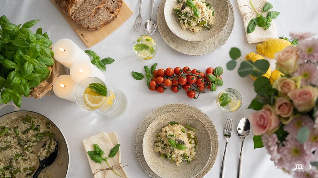 Ein Gericht, das perfekt zur italienisch inspirierten Frühlingsküche passt, ist Zitronen-Risotto mit grünem Spargel. Der Spargel wird zunächst gewaschen und vorbereitet und kann – besonders bei dickeren Stangen – kurz im Spargelkocher gegart werden, sodass er gleichmäßig und schonend weich wird und sein frischer Geschmack erhalten bleibt. Anschließend wird er in Stücke geschnitten. Währenddessen wird der Risottoreis in einem Kochtopf langsam mit heißer Brühe gegart. Dabei wird die Brühe nach und nach hinzugegeben und regelmäßig gerührt, bis das Risotto seine typische cremige Konsistenz bekommt. Zum Schluss werden der vorbereitete Spargel, etwas Zitronenabrieb, frisch geriebener Parmesan und ein Schuss Olivenöl untergerührt, die dem Gericht eine frische, mediterrane Note verleihen. Praktische Küchenhelfer wie Reiben für den Parmesan, Kochlöffel zum Rühren, Spargelkocher für die schonende Zubereitung des Spargels und hochwertige Töpfe erleichtern die Zubereitung und sorgen für ein besonders gutes Ergebnis. Serviert in tiefen Tellern oder Schalen und mit frisch geriebenem Parmesan garniert, bringt dieses Gericht die Leichtigkeit des Frühlings und ein Stück Dolce Vita direkt auf euren Tisch.